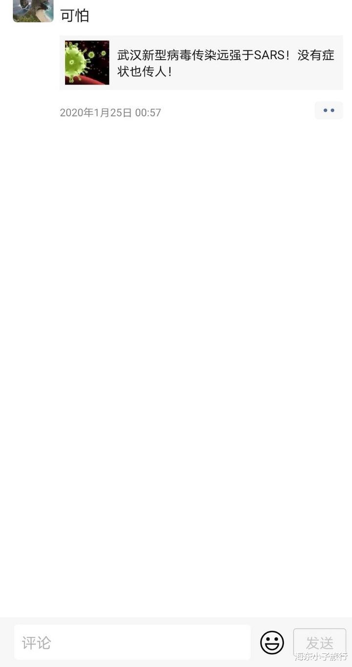 这是1月25号零点这位兄弟发的朋友圈,这个时候感到害怕了,在新冠肺炎没有症状也传人的消息发布后,估计很多武汉人都是从先前的满不在乎转变为恐惧,开始自我隔离不敢出门了。