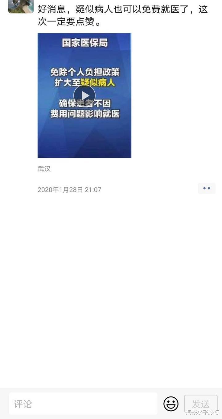 1月28日,国家发布关于对新冠肺炎疑似病人治疗免费的消息,这对大面积发病的武汉无疑是一重大的好消息,这位兄弟发朋友圈点赞。