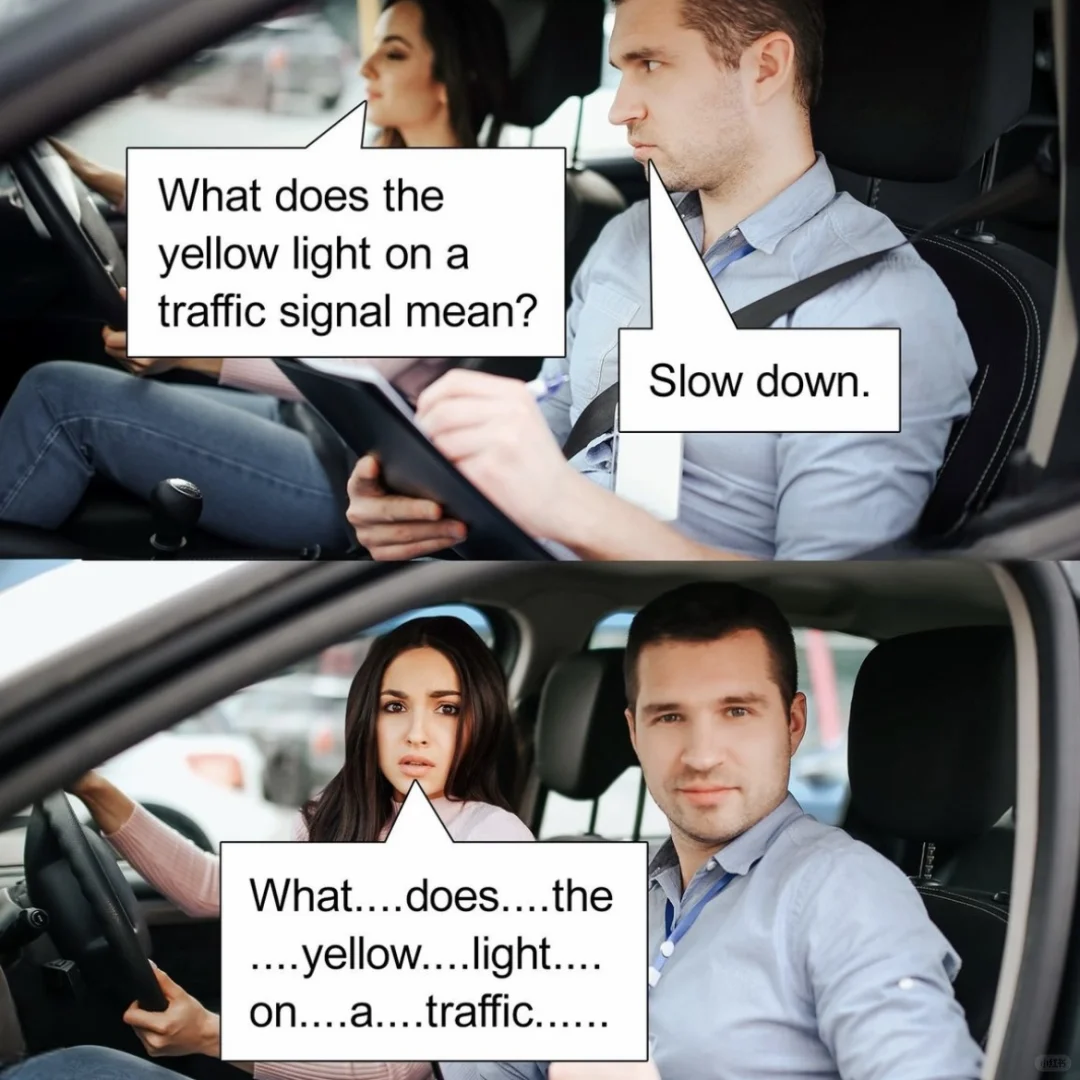 9)女的以为‘slow down’是让他说话速度慢一些,其实男的在解释交通上“yellow light”的含义;