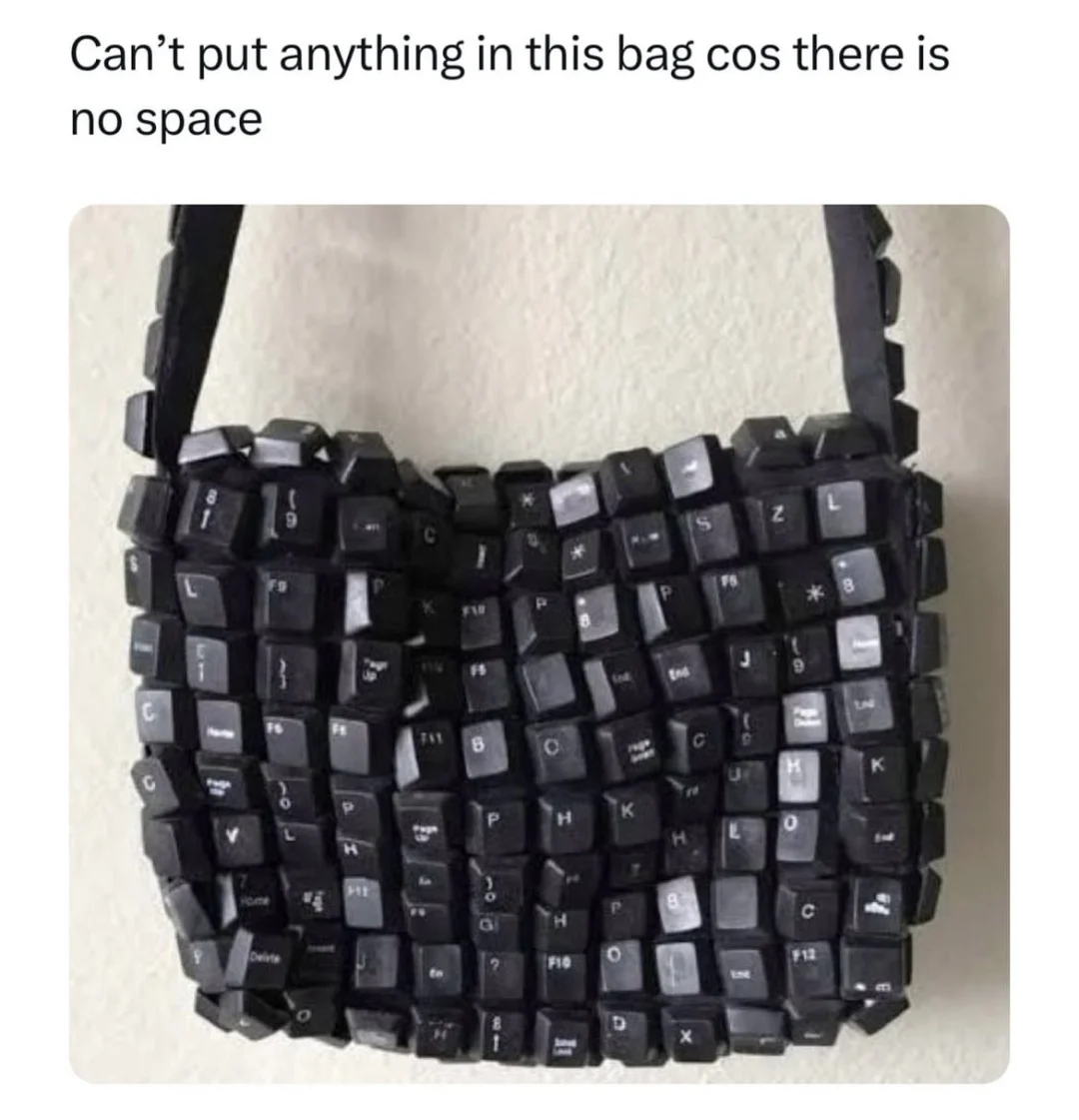 2)space空格键,双关为:这个用键盘做的包没有空间(space)/没有空格键(space);