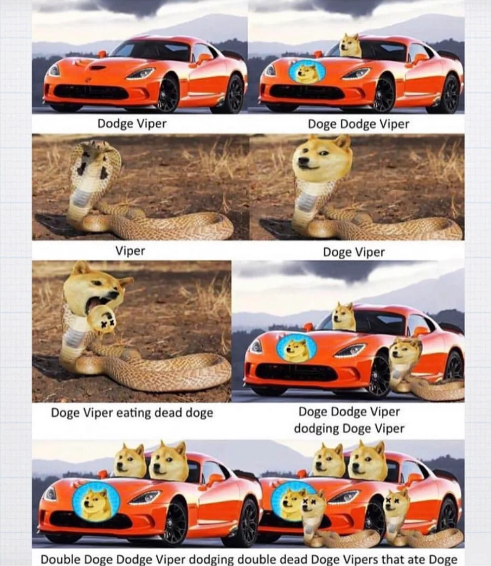 18)Doge & Dodge Viper (道奇蟒蛇车)& dodge (躲避)& viper (蟒蛇)之间的冷笑话。