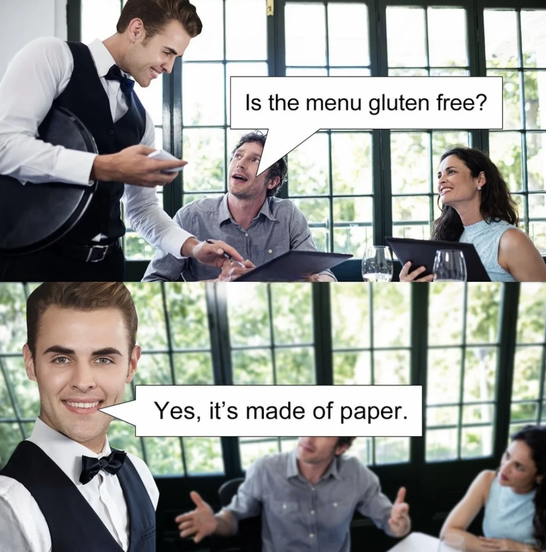 15)服务生把“菜单里的菜”听成是“菜单”材质本身,所以对方问“菜单里的菜是否不含麸质”,他回“是的,菜单是由纸做的”;