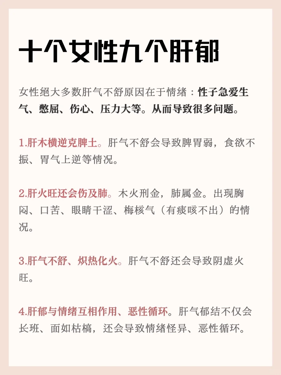 肝气不舒大都是由于情绪不好引起的,压力大、伤心憋屈、性子急脾气大,心情不好都会引起肝气郁结。肝气不顺后情绪会更加不好,从而恶性循环。