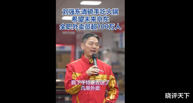 刘强东穿着红色京东工服,和40多名外卖小哥围坐一桌。他夹起一筷子毛肚,突然开口:“兄弟们,我希望京东全职外卖员能超过100万。”