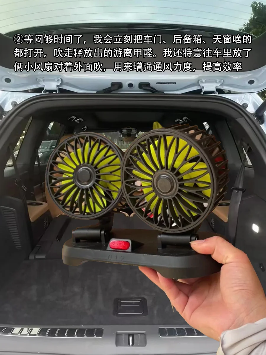 ②等闷够时间了,我会立刻把车门、后备箱、天窗啥的都打开,吹走释放出的游离甲醛。我还特意往车里放了俩小风扇对着外面吹,用来增强通风力度🌪提高效率