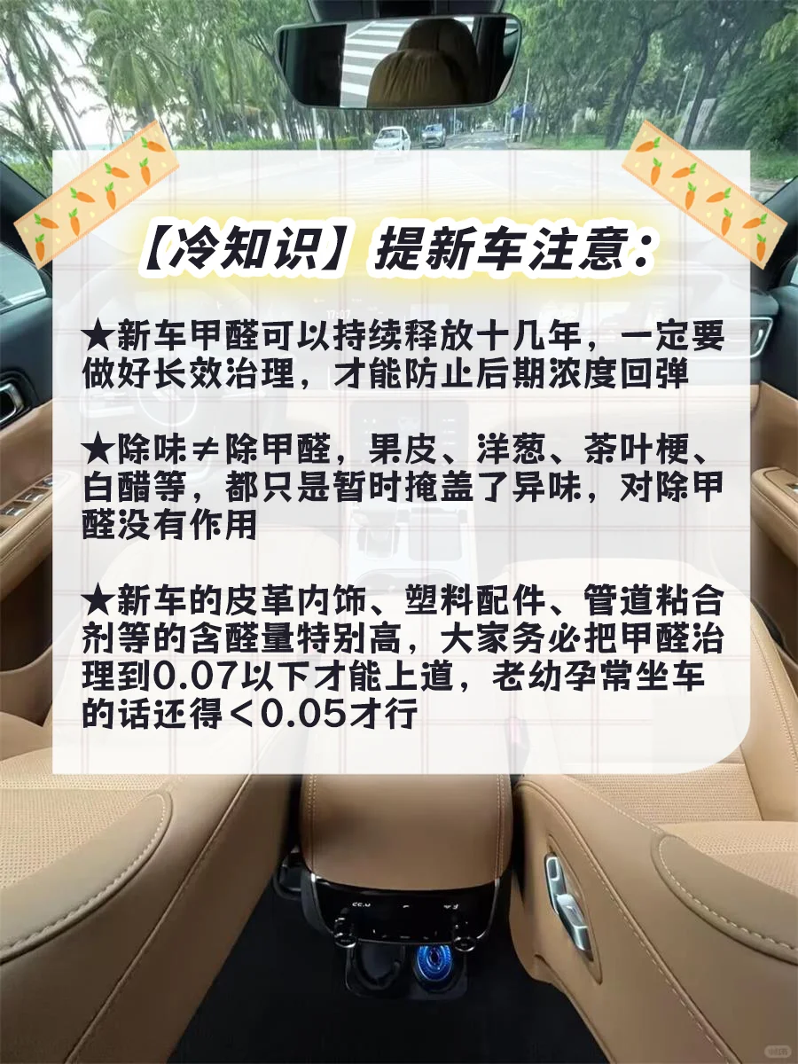 🌟新车的皮革内饰、塑料配件、管道粘合剂等的含醛量特别高,大家务必把甲醛治理到0.07以下才能上道,老幼孕常坐车的话还得<0.05才行