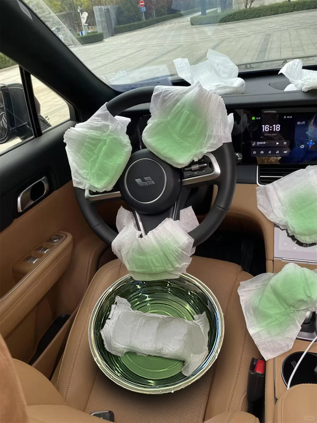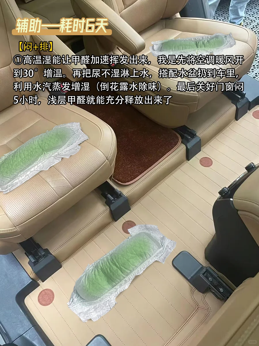 ①高温湿能让甲醛加速挥发出来,我是先将空调暖风开到30°增温。再把尿不湿淋上水💧搭配水盆扔到车里,利用水汽蒸发增湿(倒花露水除味)。最后关好门窗闷5小时,浅层甲醛就能充分释放出来了