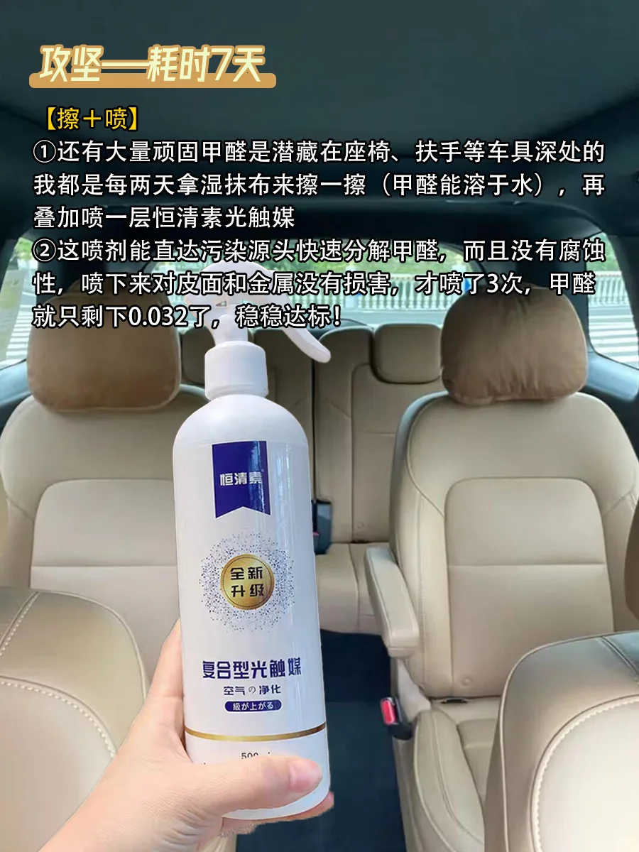 ①还有大量顽固甲醛是潜藏在座椅、扶手等车具深处的,我都是每两天拿湿抹布来擦一擦(甲醛能溶于水),再叠加喷一层恒清素光触媒🚿