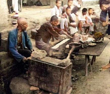 山西主要位于北方,北方人都喜欢吃面食。在照片上,只见街道旁边支着一个小摊位,摊主正在桌子上揉搓着面食,面团在手中被揉得井井有条,看起来很认真,一旁围坐着很多小孩,饥饿的等着食物,看得人十分辛酸。