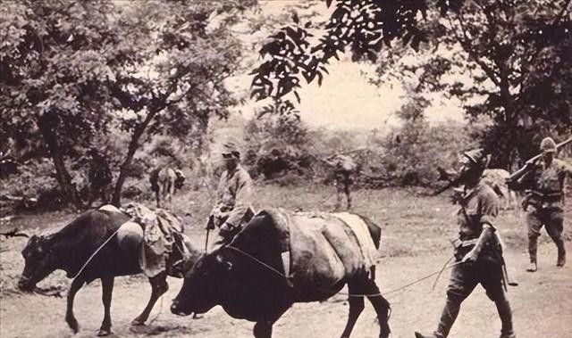 在照片中,只见一群日本人穿着军装,肩膀上扛着尖刺刀,得意的往前走着,还有两个士兵手中牵着牛,这牛正是从我国百姓家中掠夺而来的,牛似乎也被日本人吓到,它们只是在低着头向前赶路,日本人拿着鞭子似乎还想抽打牛。
