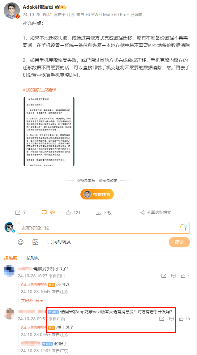 Adak封狼居胥 发布了“鸿蒙版微信迁移聊天记录的3种方式”,10月28日,其在评论区回复网友称,鸿蒙版米家App即将上架。
