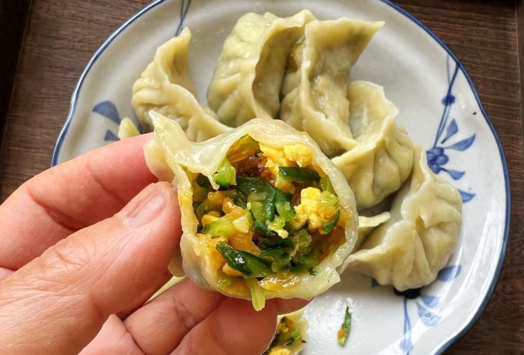 裹上面皮,包成一个个小巧的饺子,清汤下锅,不一会儿,那金黄的饺子皮就浸润了黄瓜鸡蛋的滋味,咬一口,清爽得让人满心欢喜。