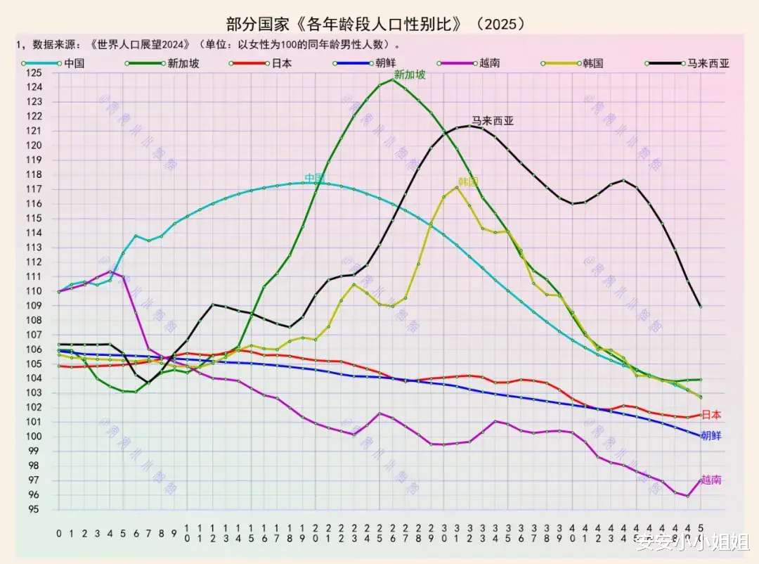 韩国则呈现出矛盾曲线:15-25岁组115的高性别比反映残余的出生性别选择影响,但40岁后快速下降至105。