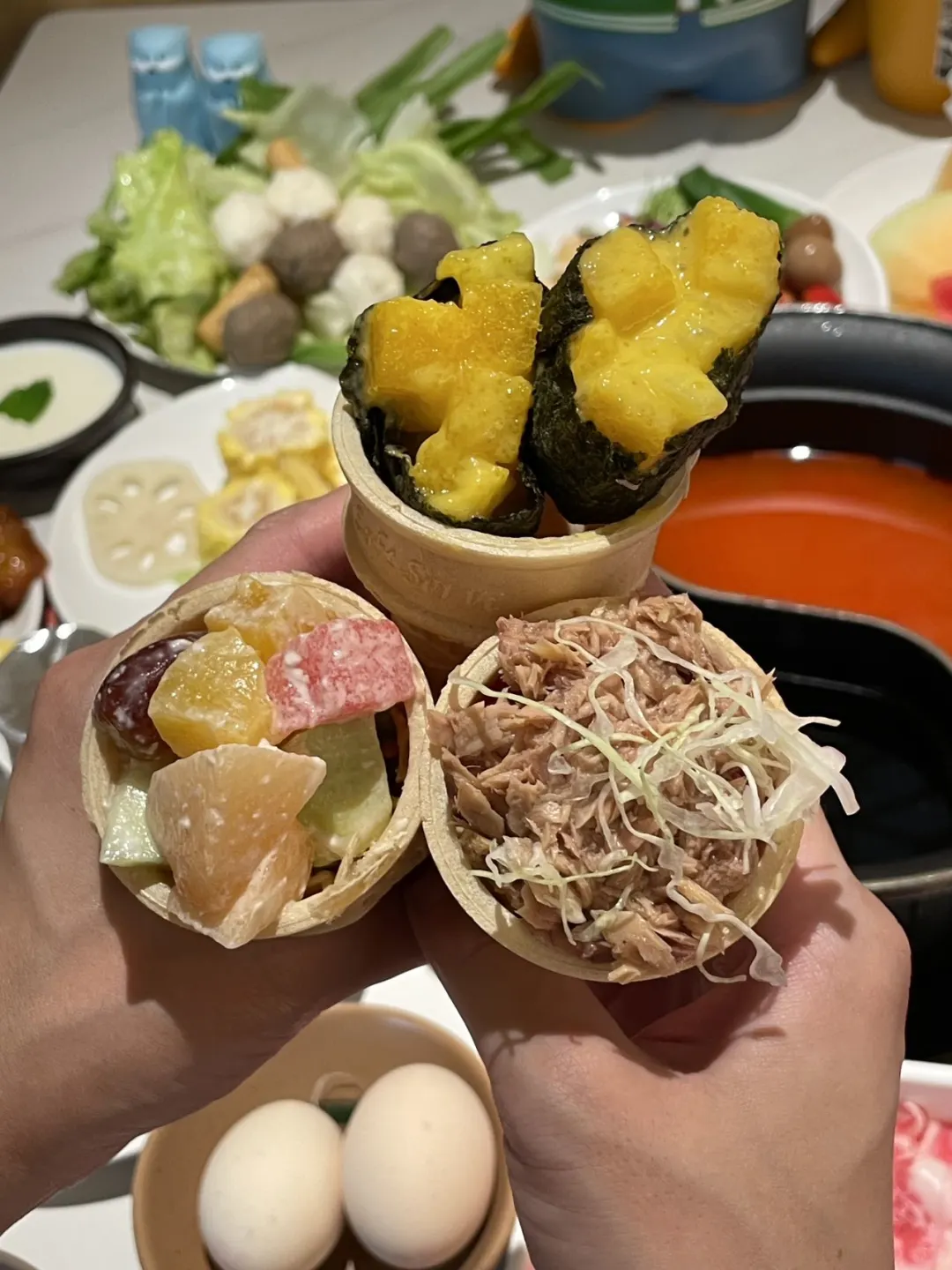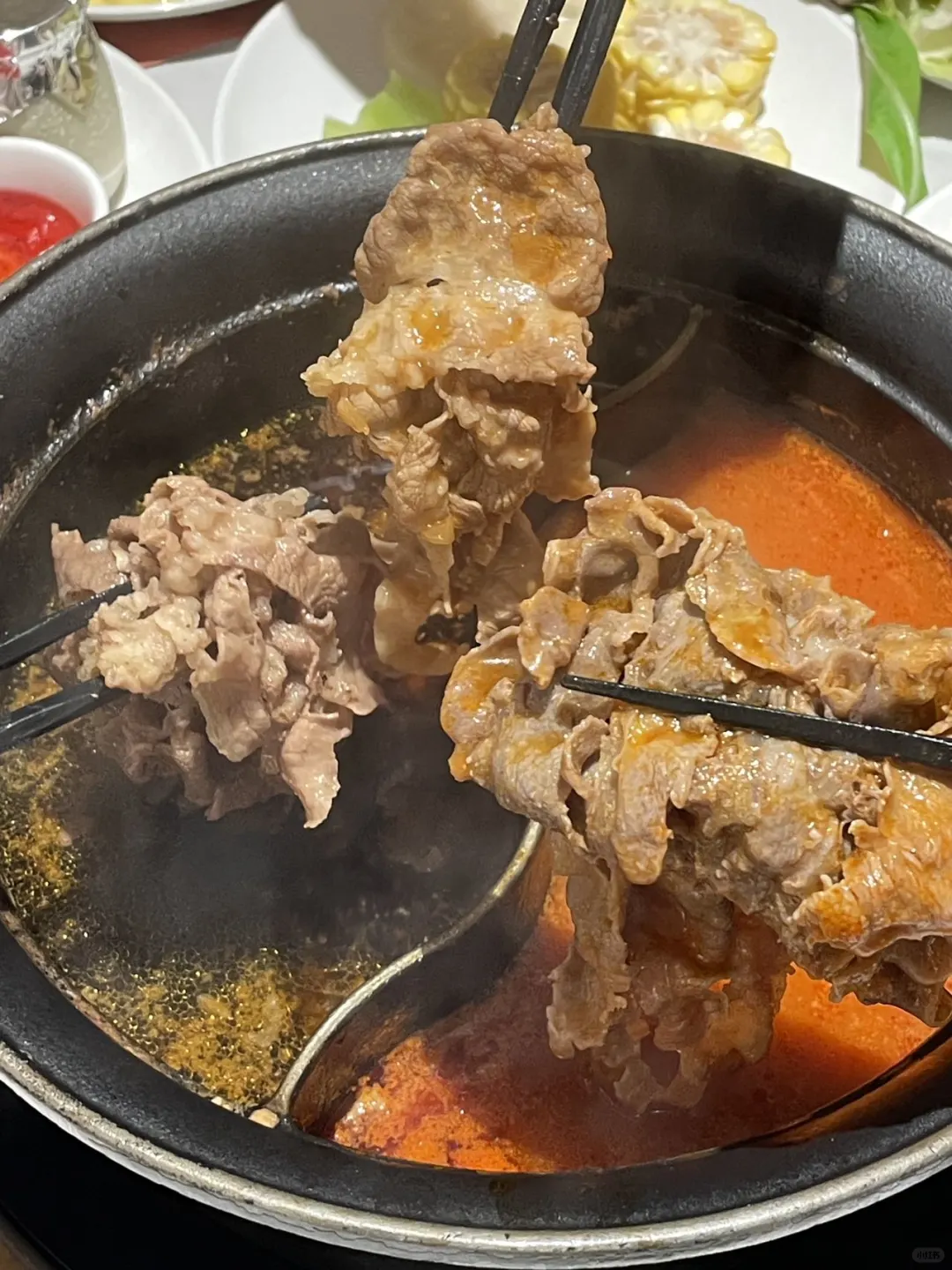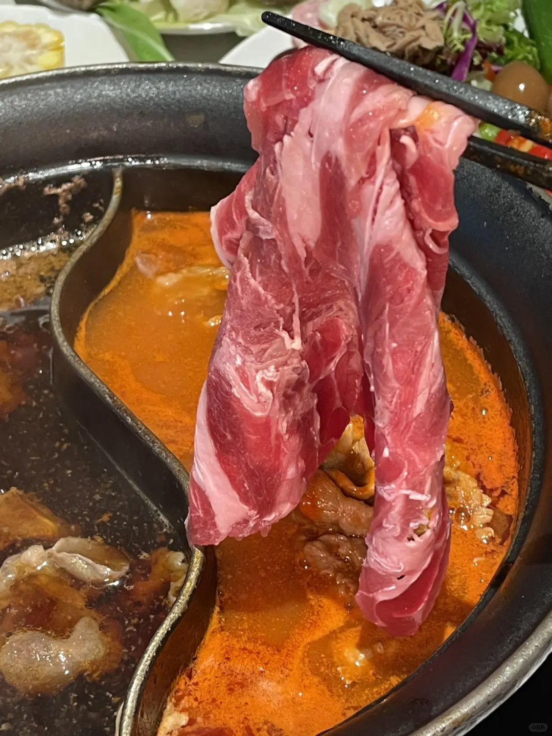 锅底是八选二的,🤩!我跟闺蜜选了二种口味的鸳鸯锅,是招牌寿喜锅和贵州红酸汤锅,服务员小姐姐告诉了我们一个隐藏吃法,就是把寿喜锅里涮好的牛肉加上新鲜水果和蔬菜🥬,然后自己DIY一个牛肉脆皮蛋卷,真是超级美味😍贵州红酸汤锅,里边是大片的番茄🍅,酸辣开胃🤤涮什么都好吃😋酸辣的口味的牛肉确实是可以让人食欲大增😂