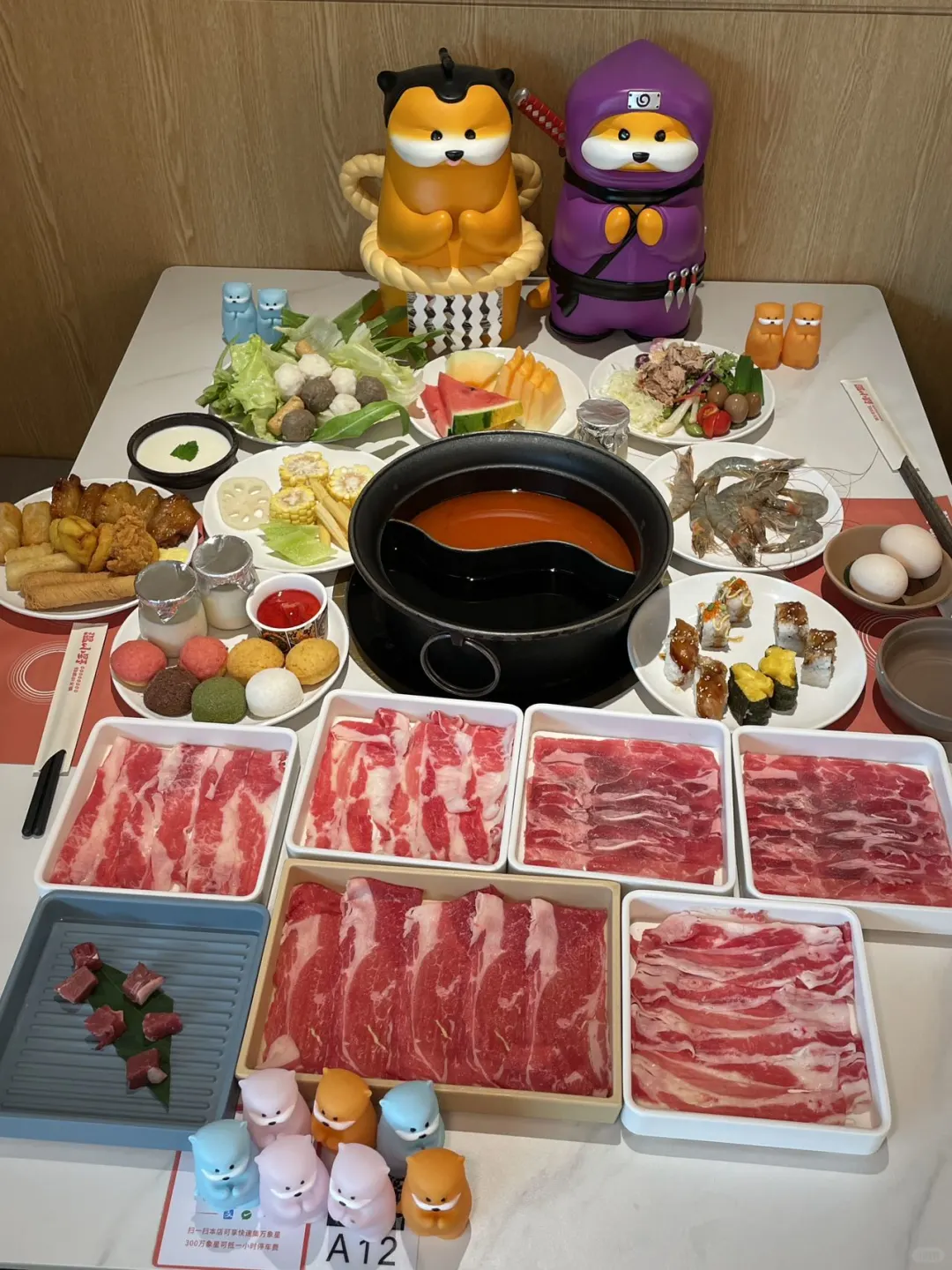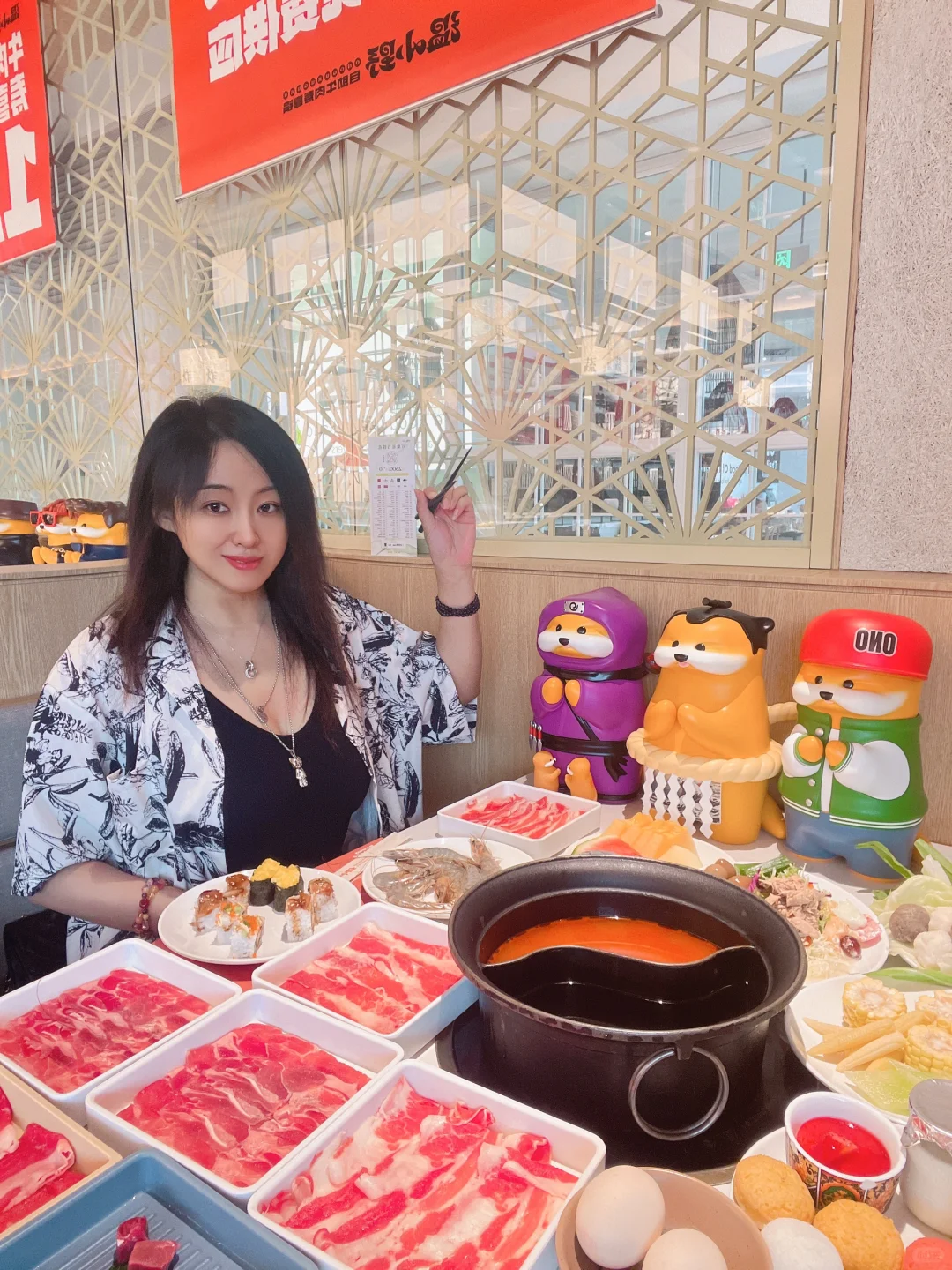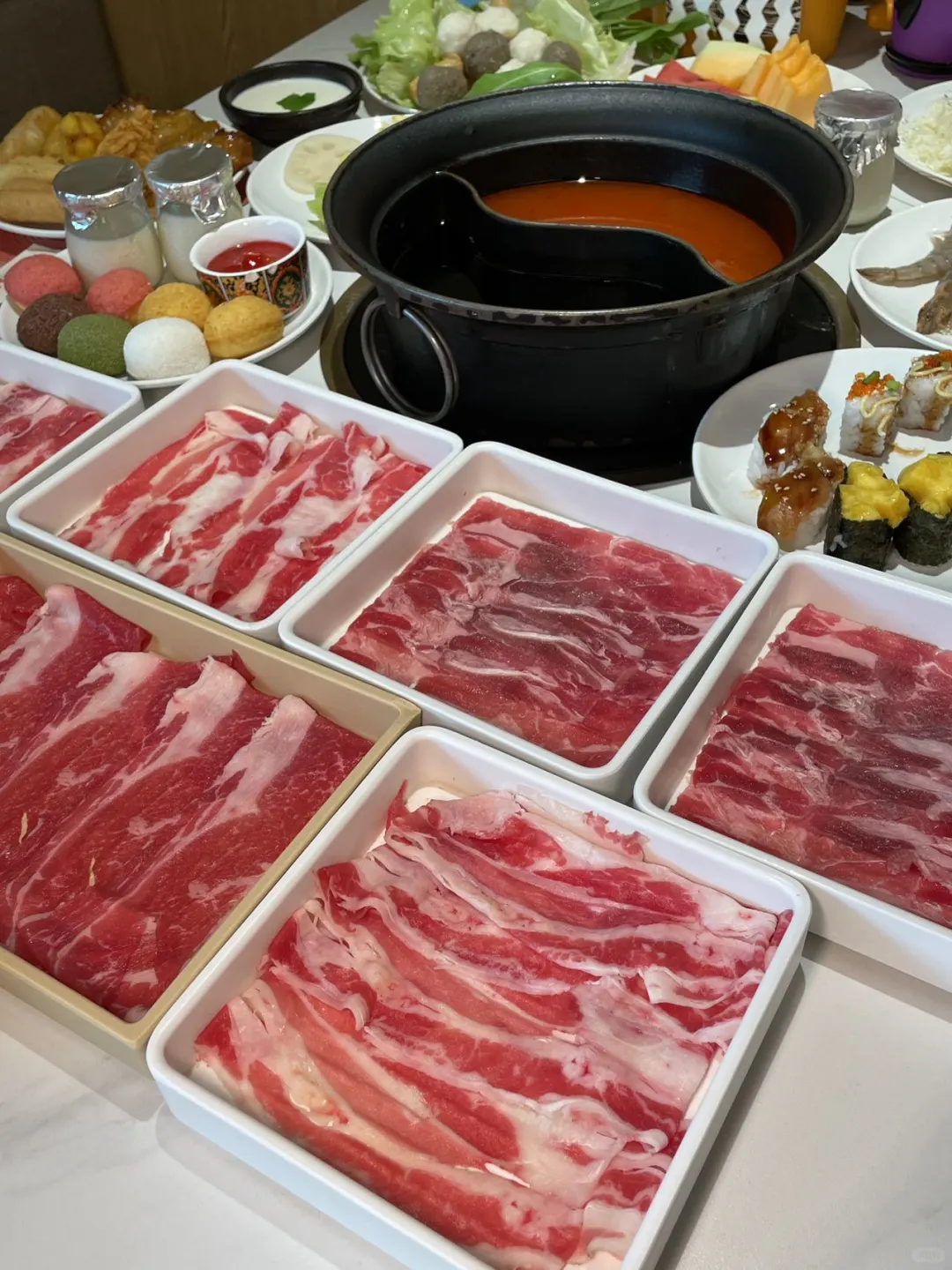 锅底是八选二的,🤩!我跟闺蜜选了二种口味的鸳鸯锅,是招牌寿喜锅和贵州红酸汤锅,服务员小姐姐告诉了我们一个隐藏吃法,就是把寿喜锅里涮好的牛肉加上新鲜水果和蔬菜🥬,然后自己DIY一个牛肉脆皮蛋卷,真是超级美味😍贵州红酸汤锅,里边是大片的番茄🍅,酸辣开胃🤤涮什么都好吃😋酸辣的口味的牛肉确实是可以让人食欲大增😂