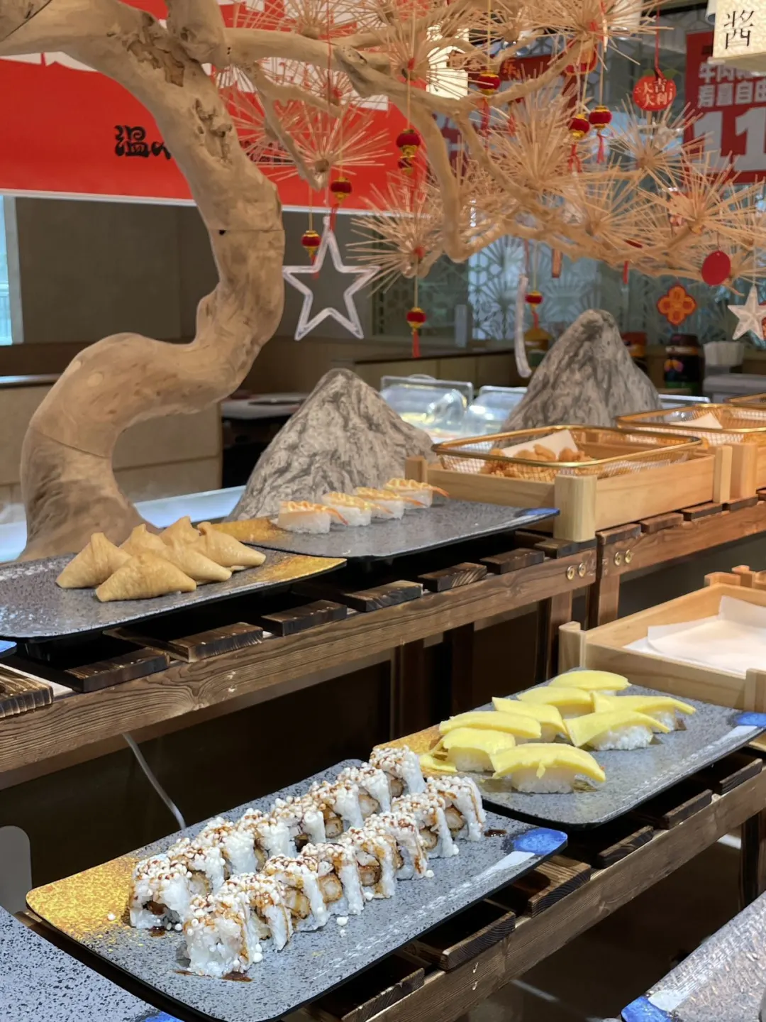 在凉菜区,有金枪鱼肉🥩和多种蔬菜🥗可选,可以自己DIY一个蔬菜沙拉,还有炸物区,都是我爱吃的炸薯条,炸鸡块,寿司🍣的品种也超级丰富,各种口味的都有,还有满满一冰柜的各式小甜品🍮和多种口味的冰淇淋🍦,也都是随便吃!