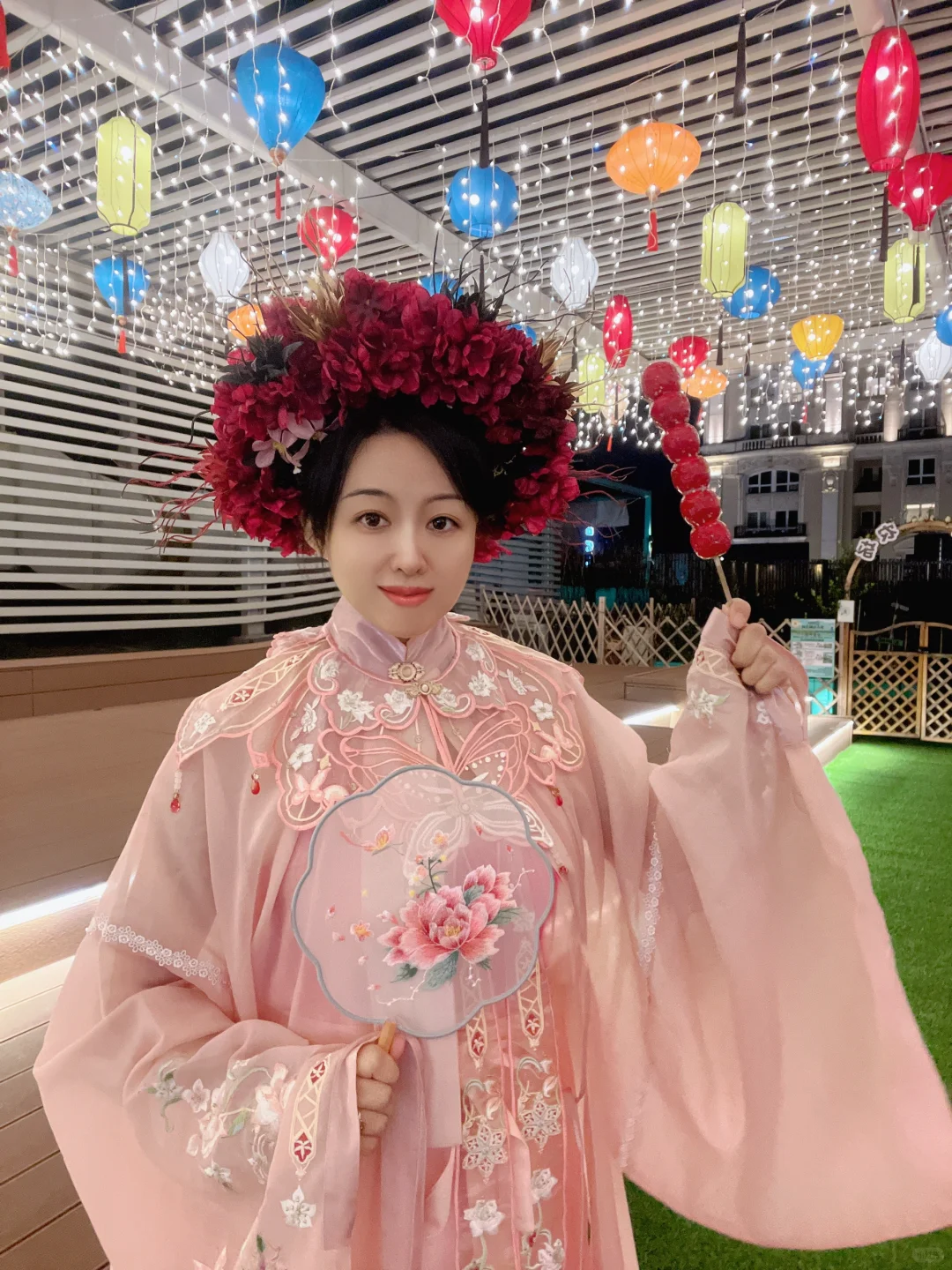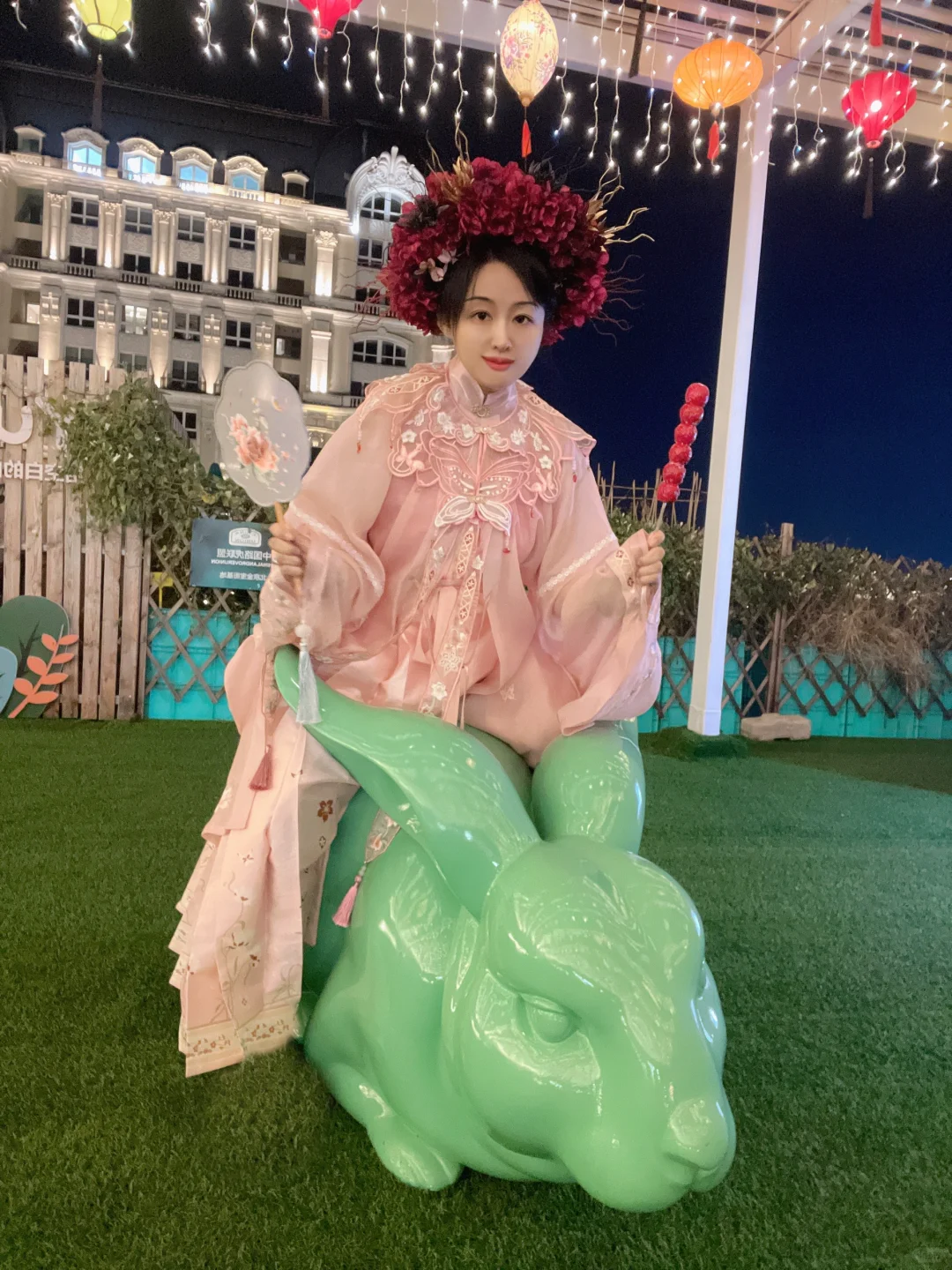 在活动现场可以任意挑选古装汉服进行装扮,款式超多,化妆和造型也都有,换上了一件粉色的汉服拍照📷,抱着可爱的小兔子🐰拍照,真有嫦娥抱玉兔的感觉了😜