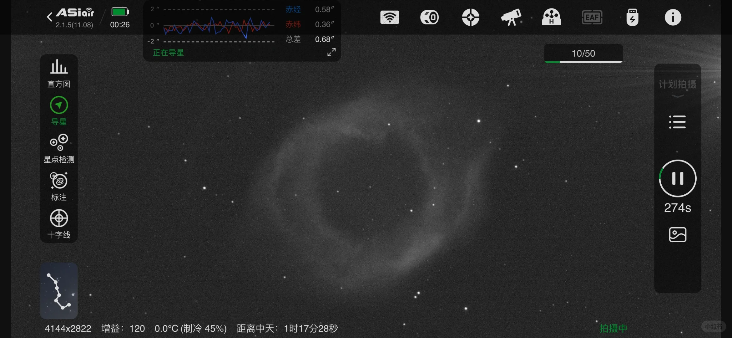 图2、3 分别是堆栈后的Ha和Oiii通道,图4、5 则是单张5分钟的效果。