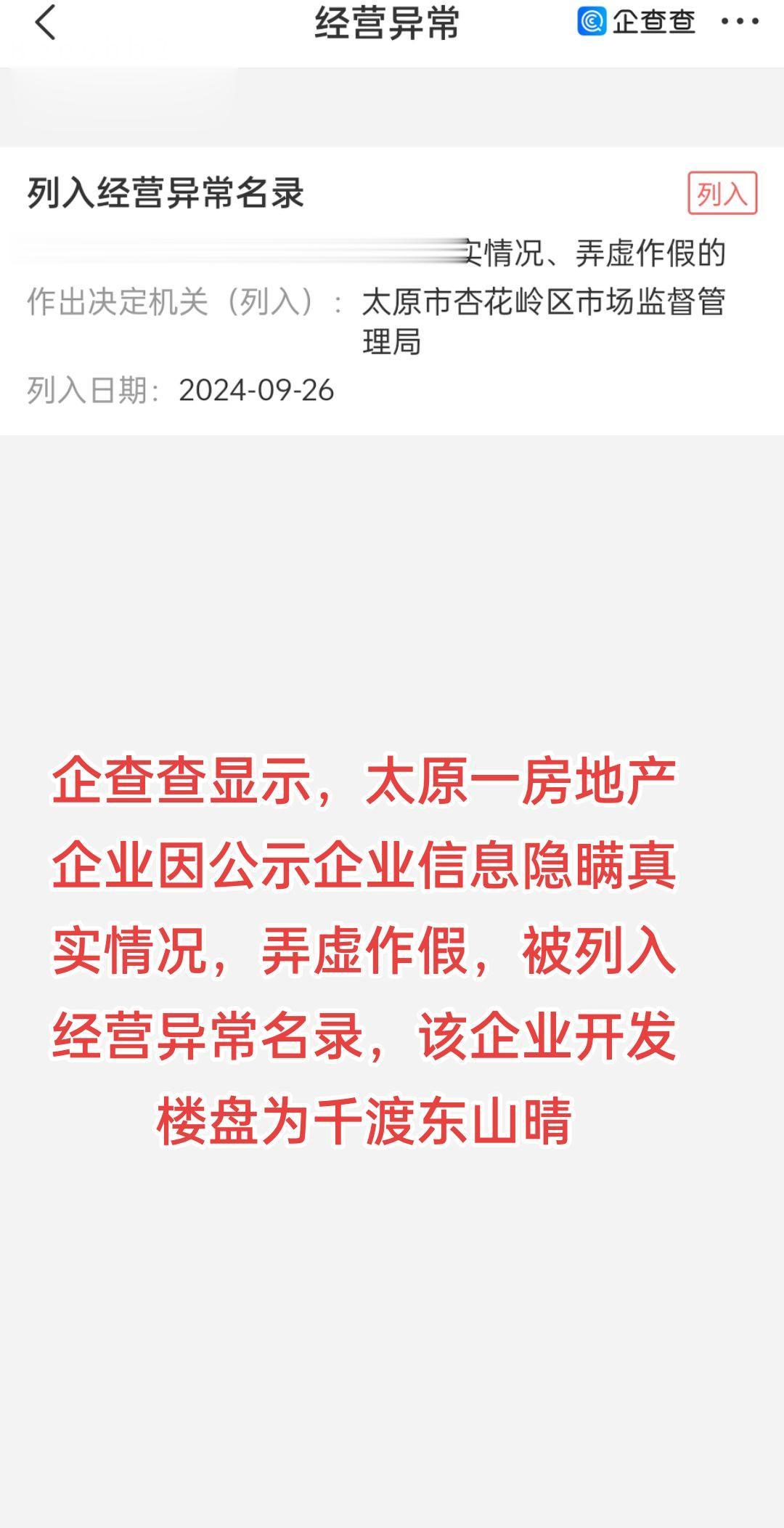 太原一房地产企业被列入经营异常名录。山西千渡房地产开发有限公司因公示企...