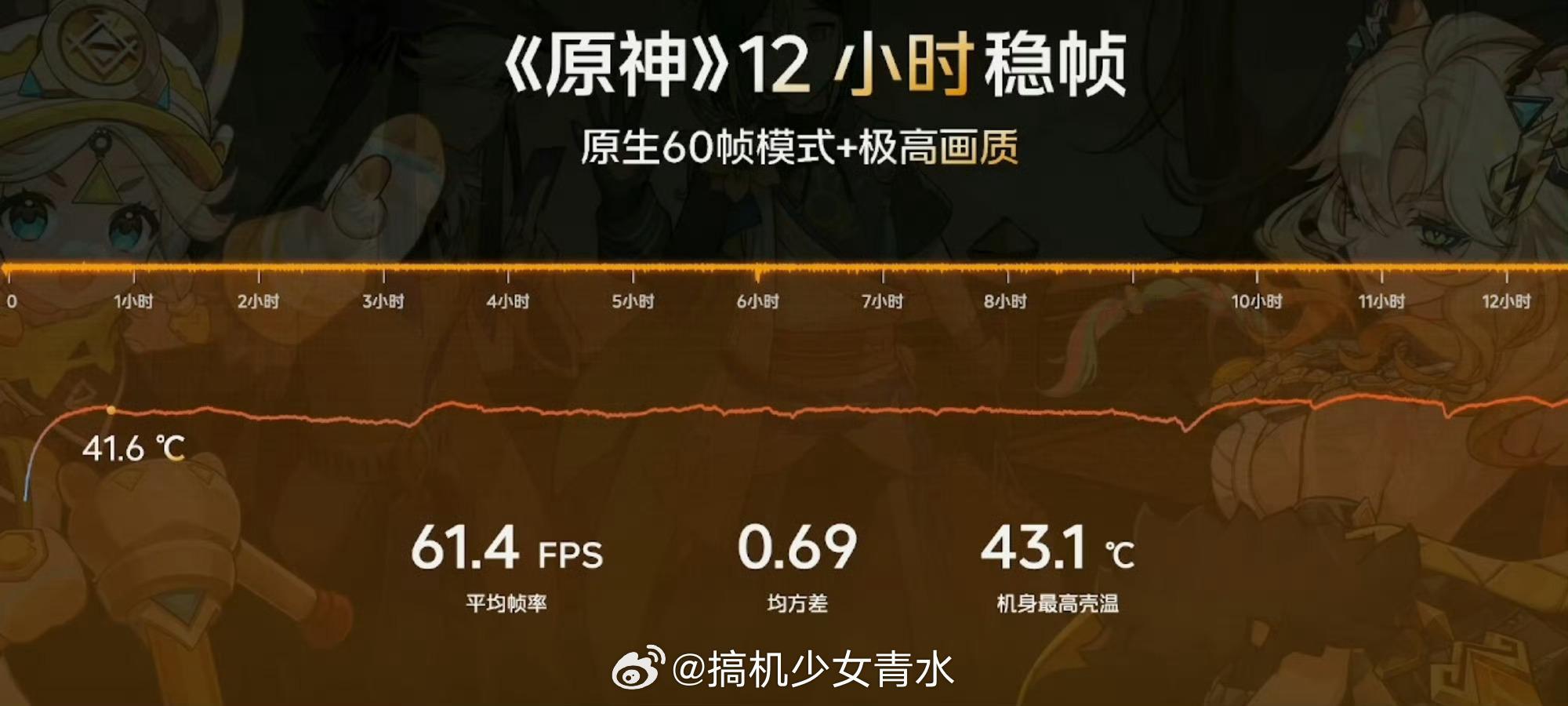 现在原神挑战都是12小时的极高画质起了,60超帧,平均帧率61.3帧,机身最高温度43.1°,