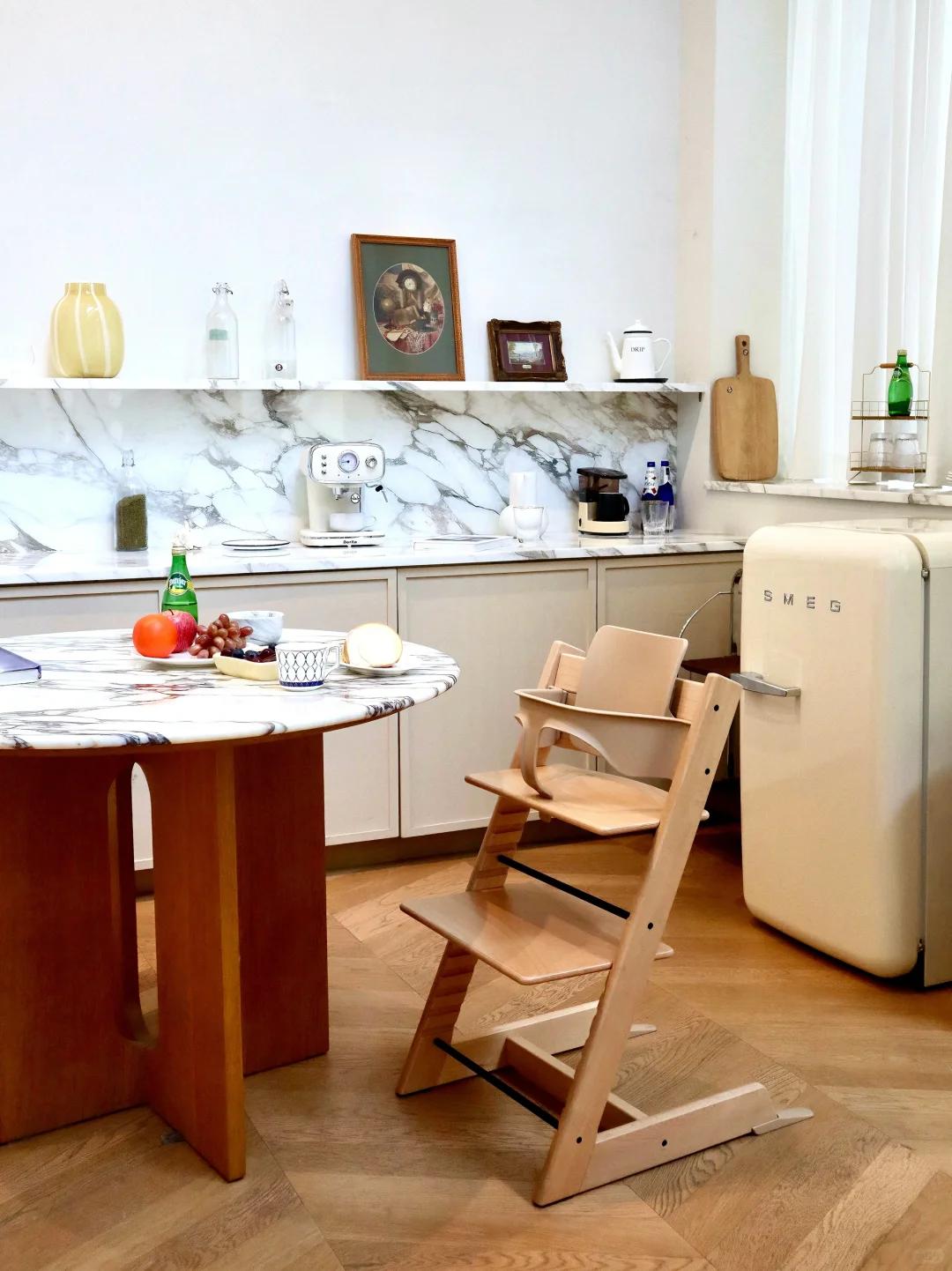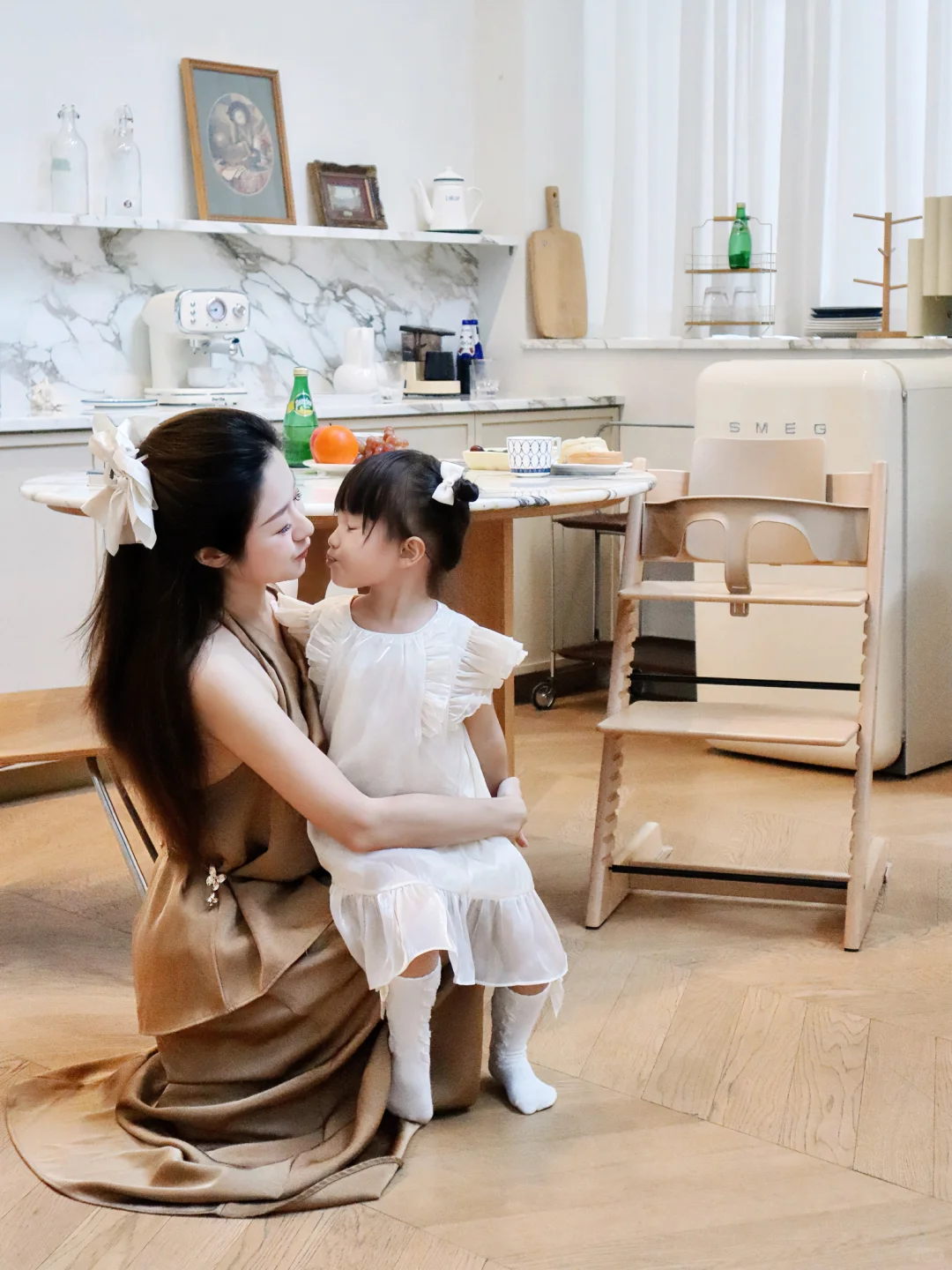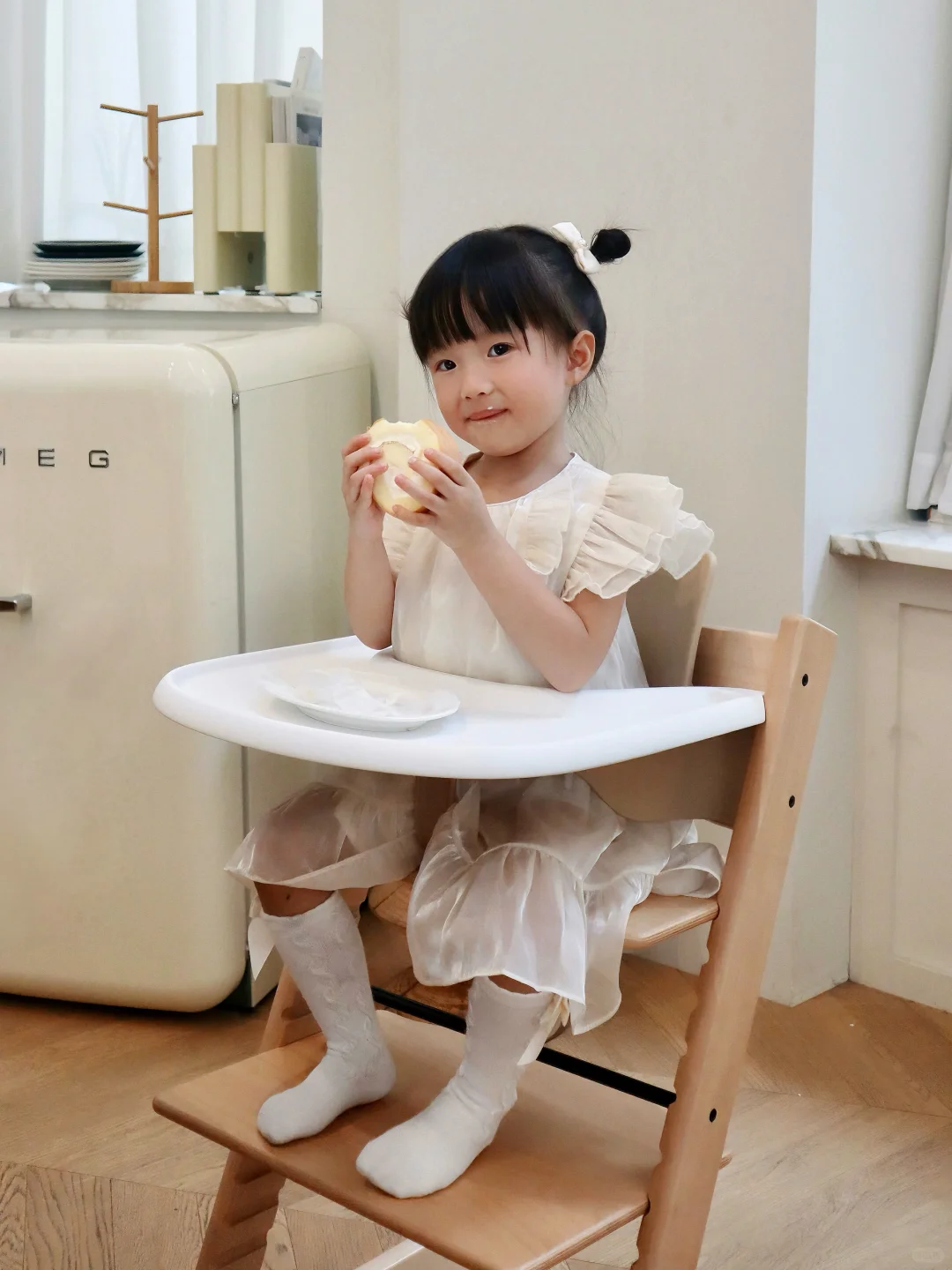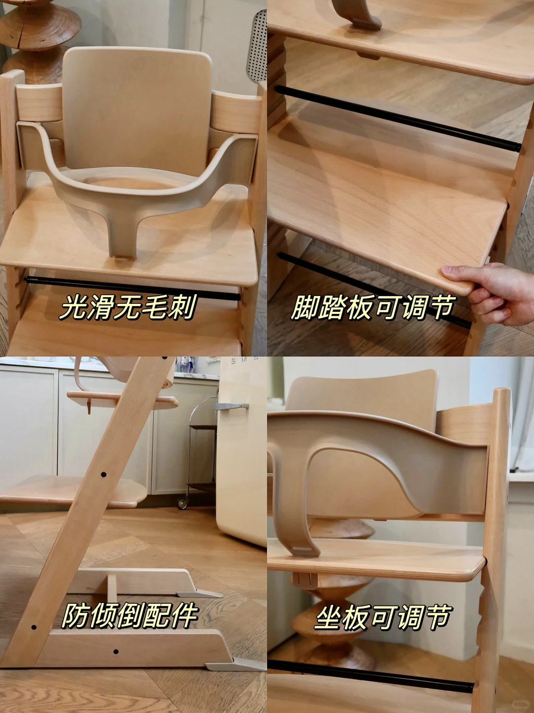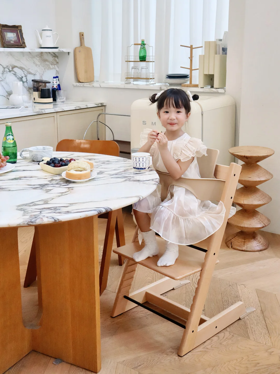 每次菲宝就自己蹬蹬爬,坐上她的宝座Stokke 家的Tripp Trapp成长椅,高级耐看的天然色调和不同的装修风格都能适配呢,厚实的木材涂上环保水性漆,实在太安心了👍🏻!三角形的结构也更加稳固,加上6个月-3岁适用的babyset护栏,安全性拉满!摸上去触感丝滑,尽显质感,这高级感有谁不爱!菲宝坐在椅子上美滋滋地吃美食,自带的餐盘🛎️不要太有仪式感了,而我就在旁边📷拍照记录她的点滴成长,成片太太太高级啦!