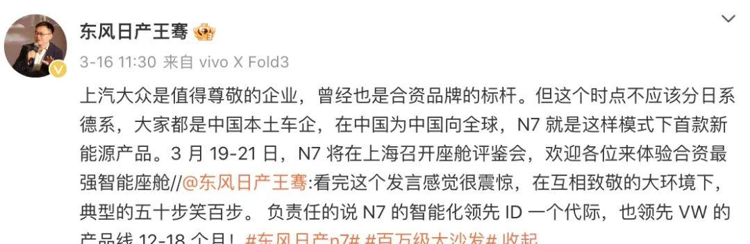 王骞在回复中,巧妙地避开了技术层面的正面硬刚。他一方面承认上汽大众的贡献,另一方面又强调了新能源时代本土化创新的重要性,并突出N7在智能化方面的领先优势。他将争论的焦点转移到“本土化”和“创新”上,这种策略更易于赢得中国消费者的认同感,将民族情绪融入其中。