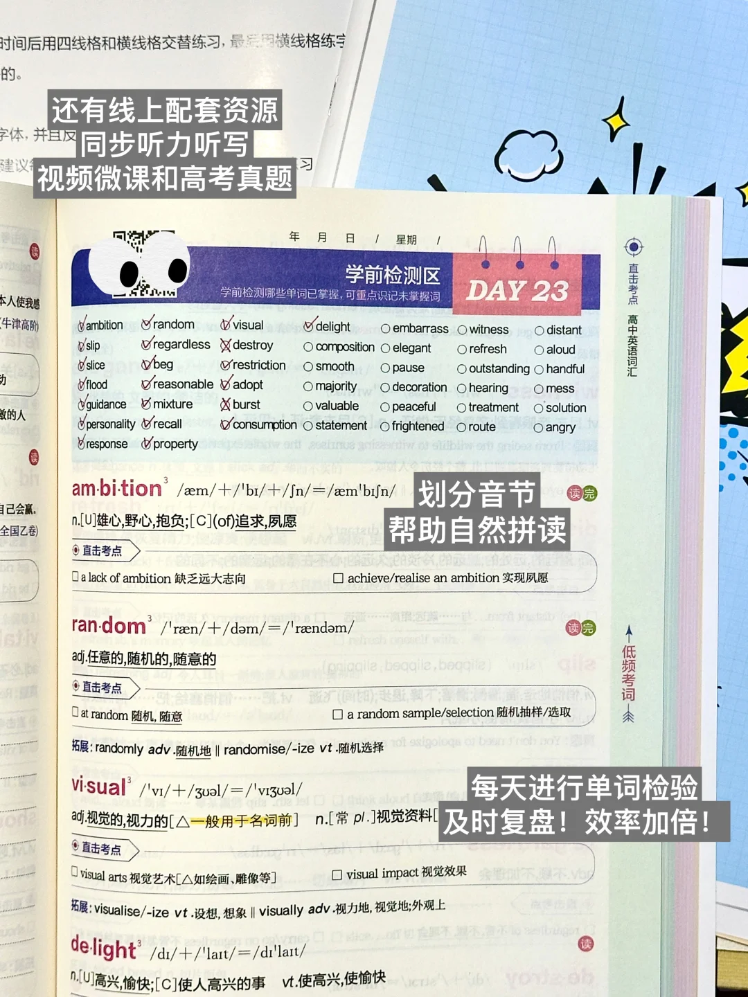 配备线上资源,听力音频、听写音频、视频微课、高考英语真题等通通拿下[暗中观察R][暗中观察R][暗中观察R]除了词汇书,还配备了词汇专练、练字达人、打卡表等,有计划进行“背诵-练习-打卡”,实现一本多功能[赞R][赞R][赞R]