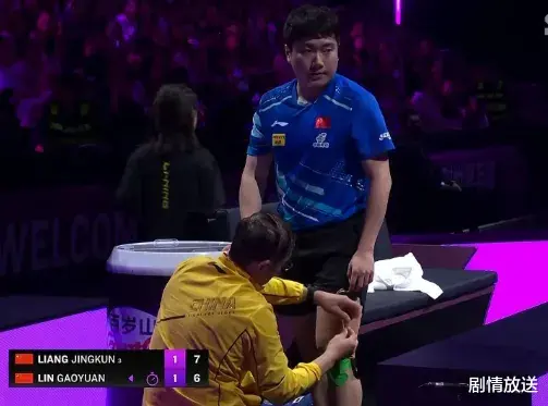 关键的第三局,战况进入白热化。梁靖崑虽腿伤在身,可斗志丝毫不减,比分紧紧咬住,还一度以7比6领先。林高远不敢大意,果断叫了暂停,想调整战术稳住局面。就在这间隙,梁靖崑向裁判紧急示意,希望趁着对手暂停,让队医处理下伤腿。