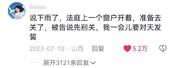 说下雨了,法庭上一个窗户开着,准备去关了,被告说先别关,我一会儿要对天发誓
