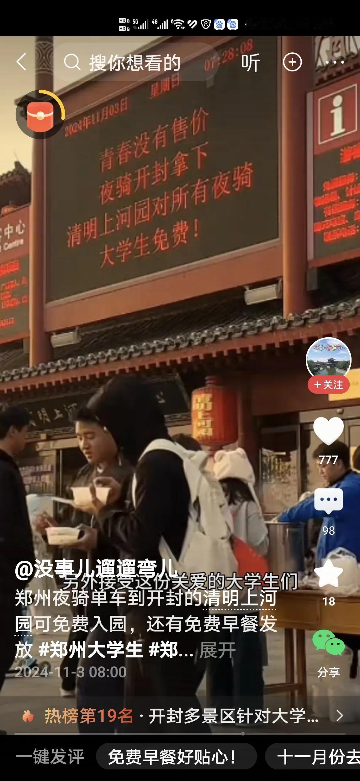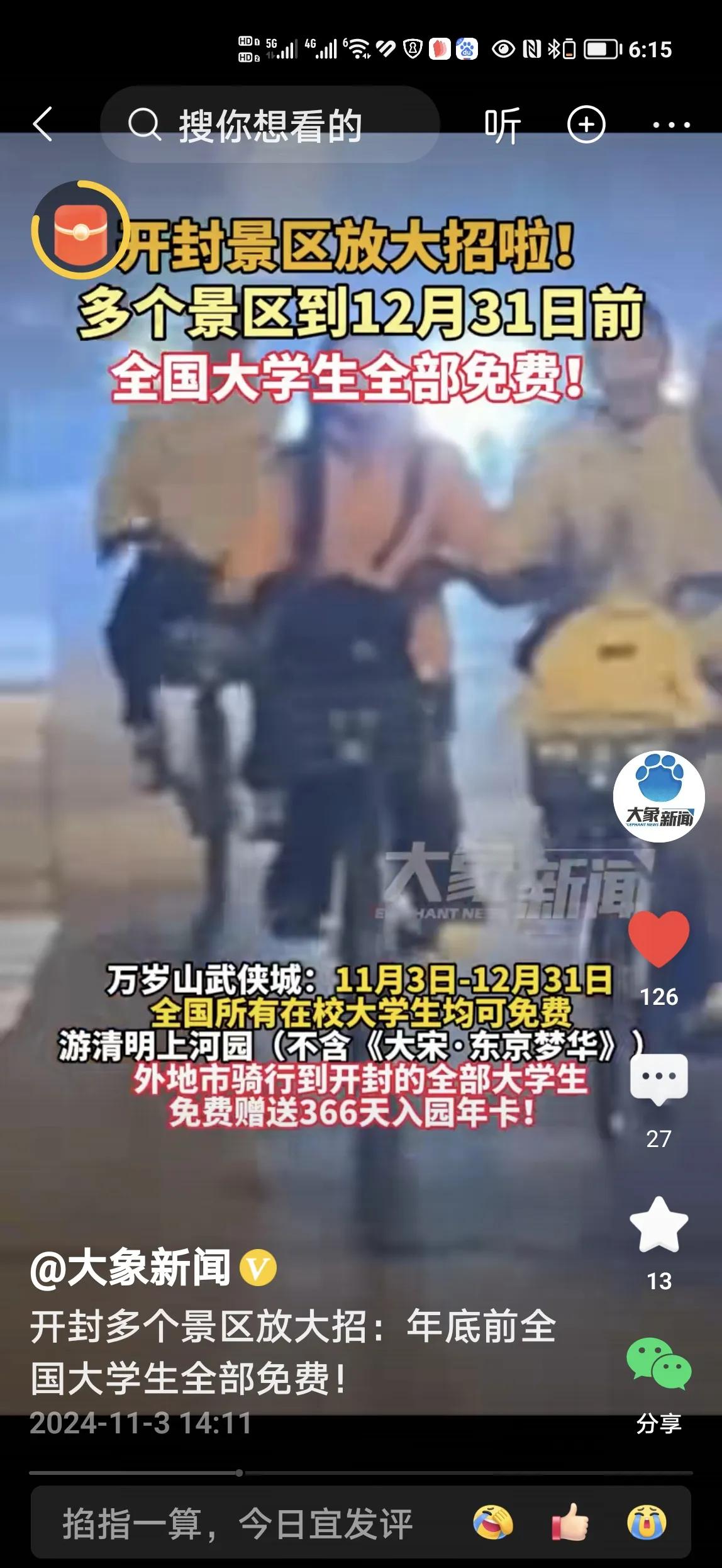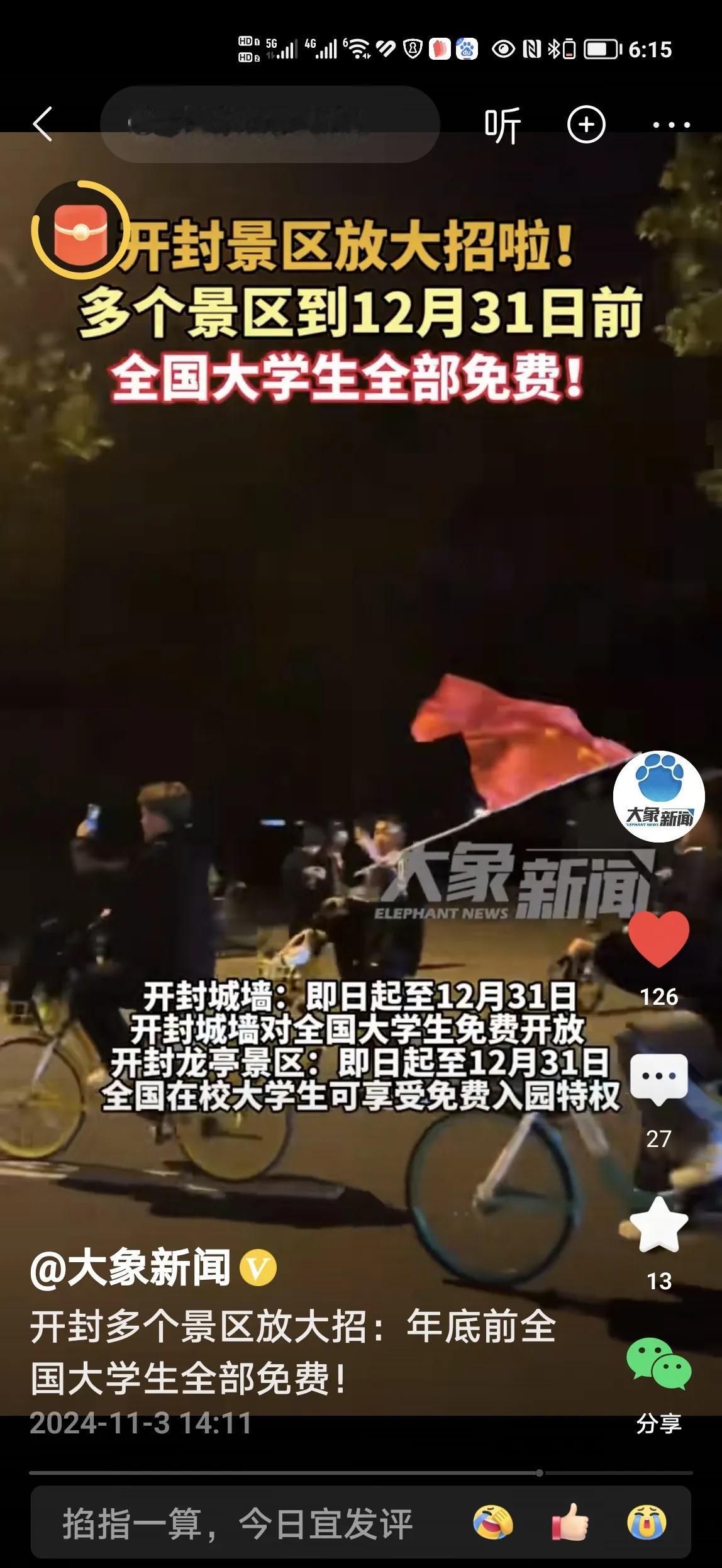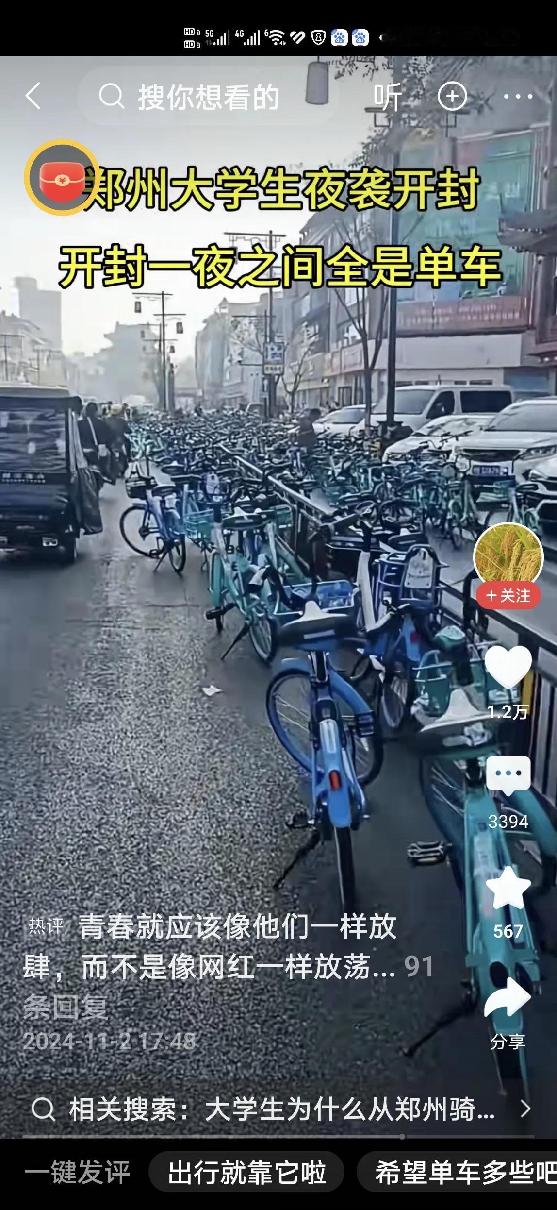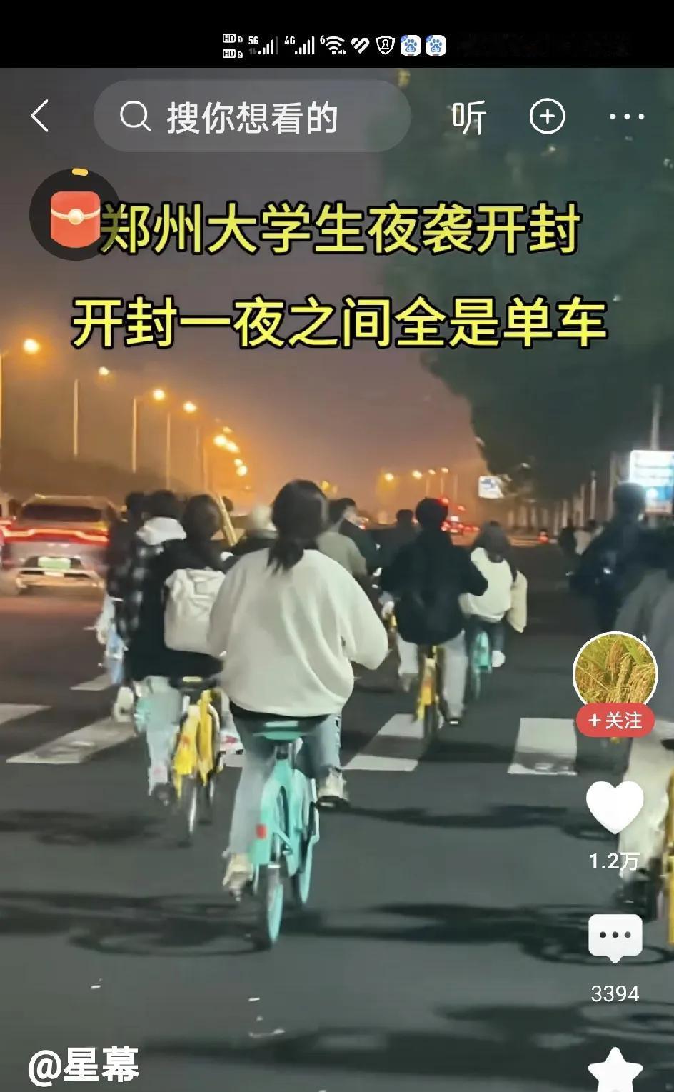 郑州大学生夜骑单车奔袭开封盛况空前俨然成了一道靓丽的风景?开封景区免费开放热情接待感人至深?年底将至大开封满大街的共享单车是否会又一次将这座古城再次推上网经热捜? 一觉醒来,打开手机,扑面而来的尽是郑州大学生夜骑单车奔赴开封的镜头和画面,无数大学生不畏严寒,兴高采烈的青春画面无不令人感到十分喜悦和震憾。 视频中发现,成群结队的郑州大学生,骑着共享单车,成群结队,打着旗号,仿佛是有组织似地在夜幕中十分快乐地向着开封骑行,一路上他们欢声笑语,无疑给人们展现了一条青春靓丽的景观。 视频中更有开封各大景区门口连间为学生免费开放,并提供热气腾腾早餐的暖人镜头。同时还有深夜的开封街头和部分网吧和餐厅大学生吃饭和栖息的画面。使开封这座古老而又神秘的古城及至深夜仍然到处弥漫着沸腾和青春的气息。 视频中更有画面显示,有成排成堆的共享单车被停放在开封街头。有关单位和部门正在用面包车将这些从郑州骑来的共享单车清运回郑。这些几乎成堆存放的共享单车,除了让人感到他载了大量的游客之外,也不让人们对他们的如何离开充满着好奇和遐想? 这是何等壮观而又耐人寻味的一组组画面啊!成千上万的郑州大学夜骑单车奔袭开封,难道他们只是为了去品尝一下开封的有名少吃灌汤包子和胡赖汤,也或是为了节省点费用去欣赏一千大开封的清明上河明,万岁山等著名的旅游风景区,或者是大学们为了体现一下自己的青春意志,有意无意地在搞一次有趣的青春长途骑行锻炼吧? 需要知道,从郑州市区骑行到开封市内,沿途距离至少在70公里左右,每一个参与活动的大学生要从郑州到达开封最少需要骑行4个小时。这对参加活动的每一个大学生来说不仅是一次体力的考验更是一个意志的锻炼。 但青春是浪漫的,郑州大学生夜袭开封的壮举,一时使这座驰名中外的开封古城再次又热闹了起来,甚至又再次冲上了网络的热搜。为眼下正在兴办的古城开封菊展明显带来了话题和流量。为开封市的整个文旅再次火遍中原赢得了强大的网络和舆论关注。 让我们为开封市突然降下的这波波天的富贵去由衷的高兴和大力的点赞吧! 据悉,开封市文旅局近日曾公开发布通告,明确指出,自本月11月3日至12月31日,并封各大旅游景区清明上河园,万岁山武侠城,翰园碑林,开封城墙景区,龙亭景区,天波杨府,铁塔景区等,全国所有在校大学生,凭有效证件可享受免费入园政策。其中朱仙镇启封故园免费时间11月3日至2025年1月28日。 也许这次郑州成千上万的大学生夜袭开封的盛大活动与上述开封文旅局推出的上述面向在校大学生的免费旅游优有着一定的关系吧?总之,成千上万的郑州大学生这夜骑单车奔袭开封壮举,已形成了强烈的媒体效应,和对全国网友十分震撼的视觉冲击。郑州大学生们的这一自发行为究竟能为开封文旅的繁荣和向全国人民传达出一种什么样的信息,或者开封市人民究竟如何做好承接和对应一定会给人们留下许多值得思考和应对的话题。大家说呢? 以上内容和图片均来自网络。本文旨在分享热点。如有侵权,联系必删。网友们对此现象有什么不同的认识和看法欢迎在评论区交流分享。