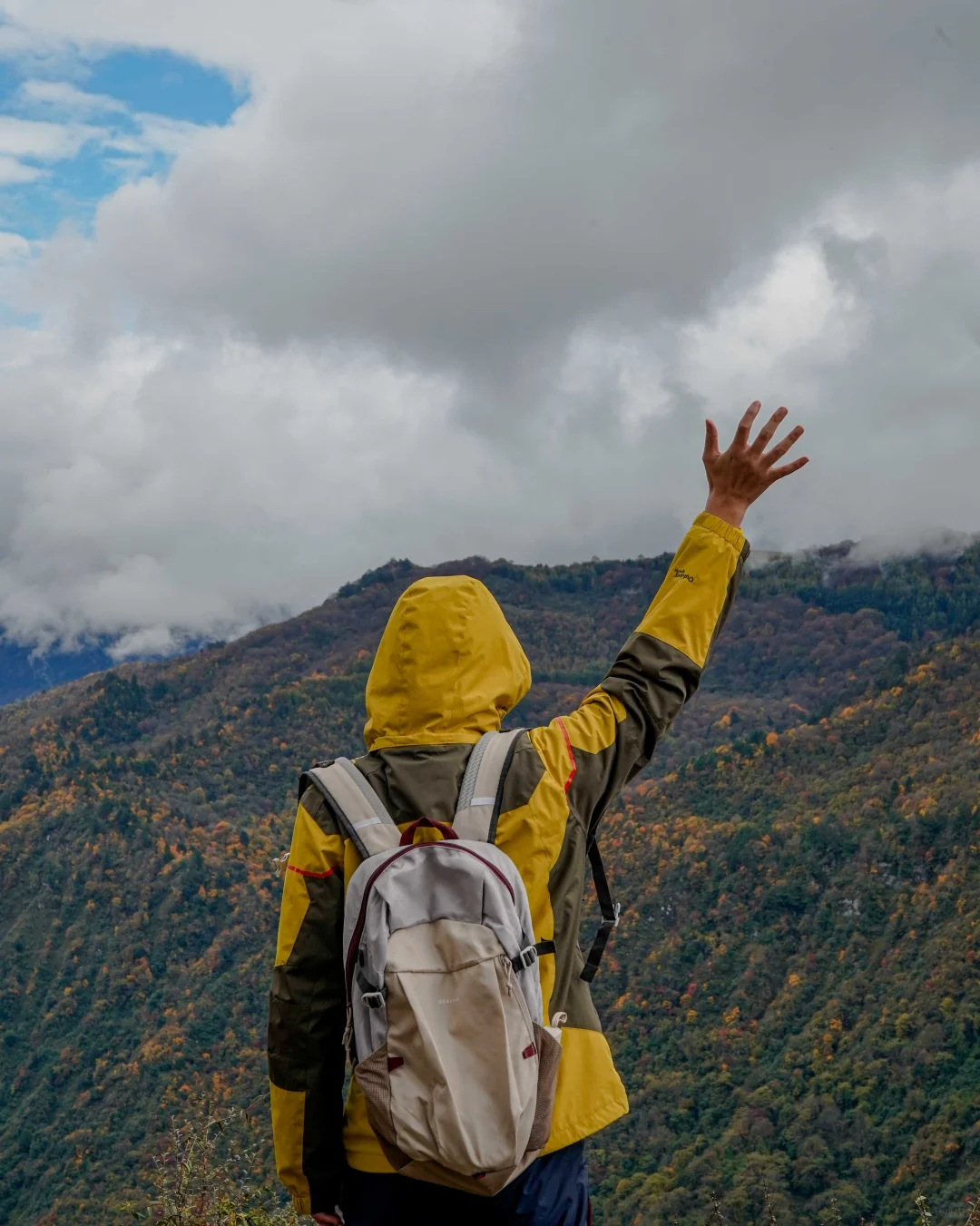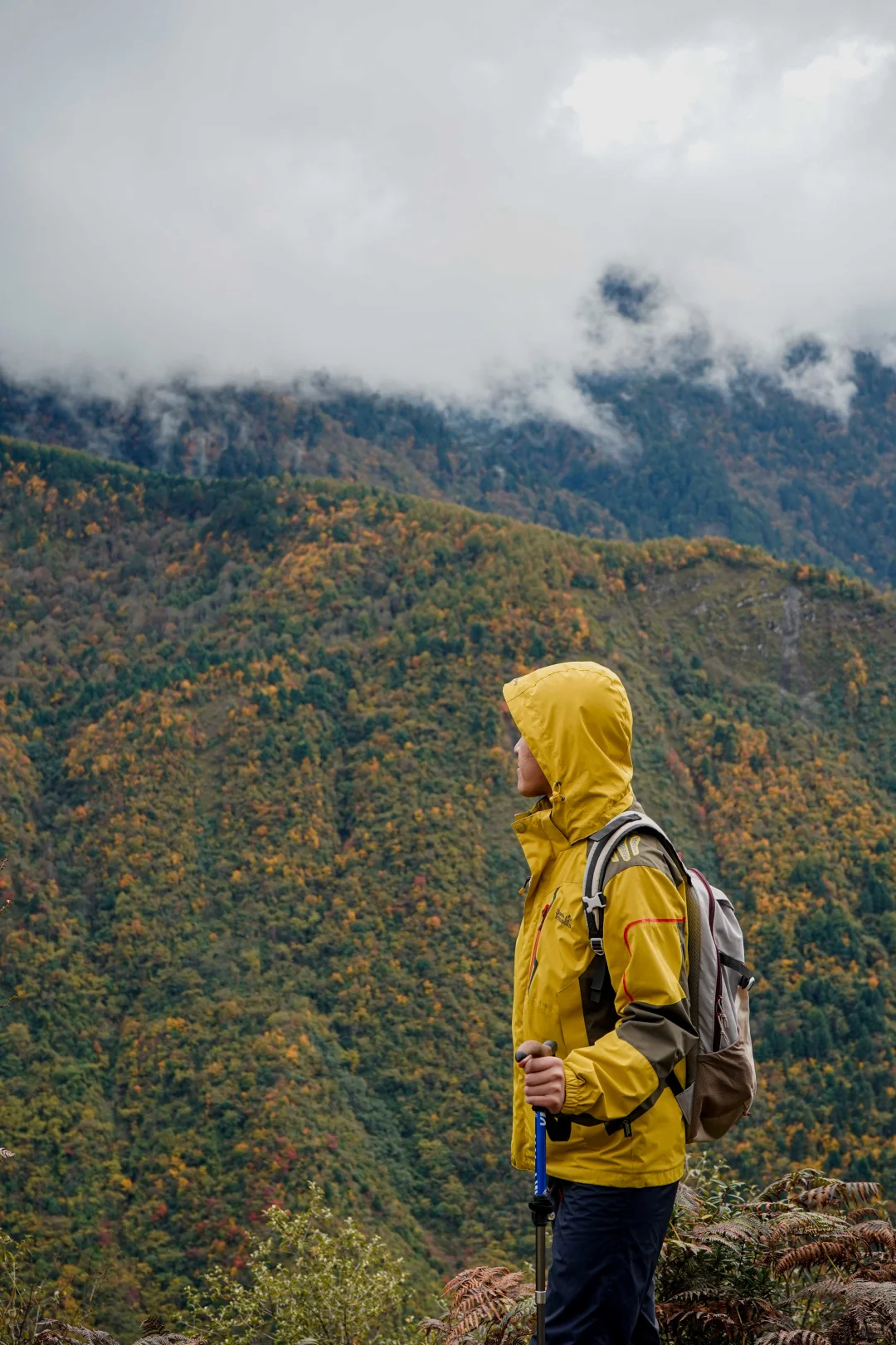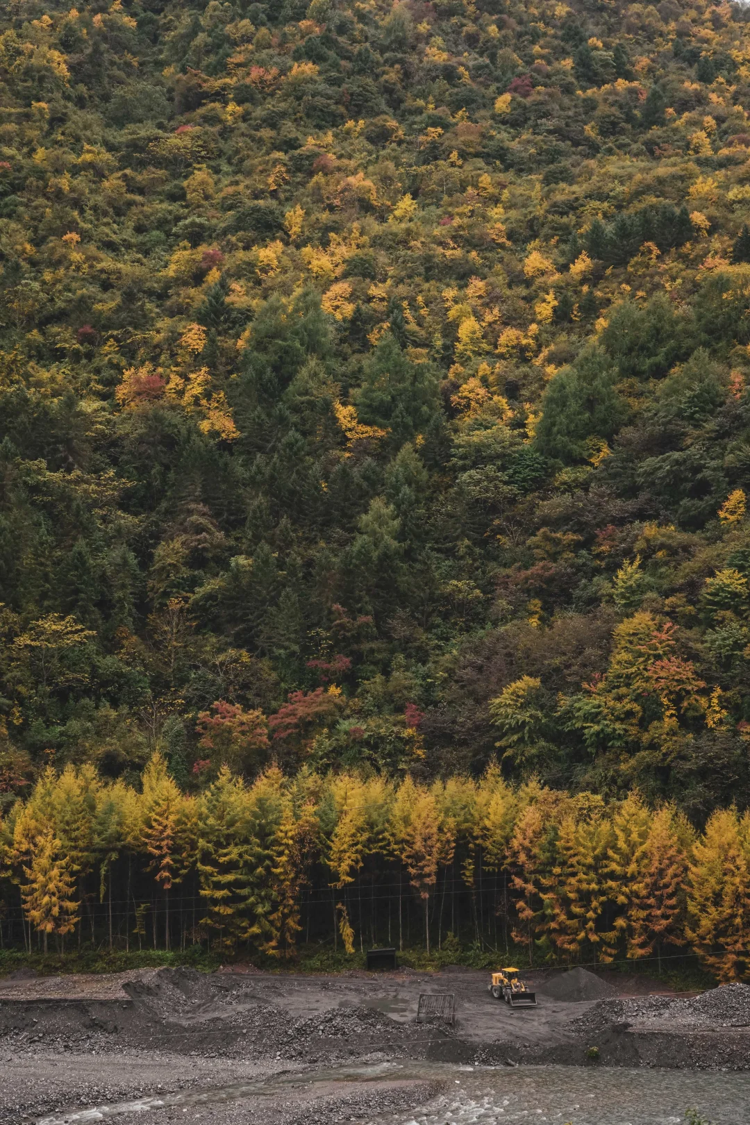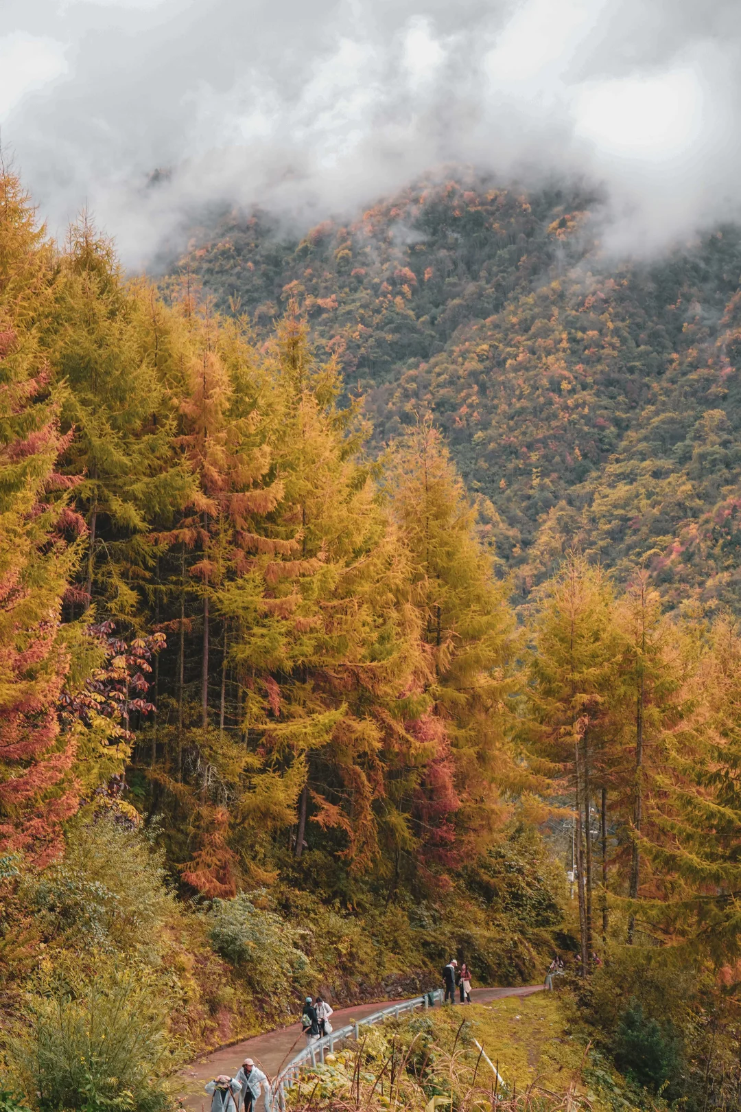 1️⃣一段路程是柏油路,沿途的松树和杉树已经一片金黄,风景很美,远眺即是重叠的彩林