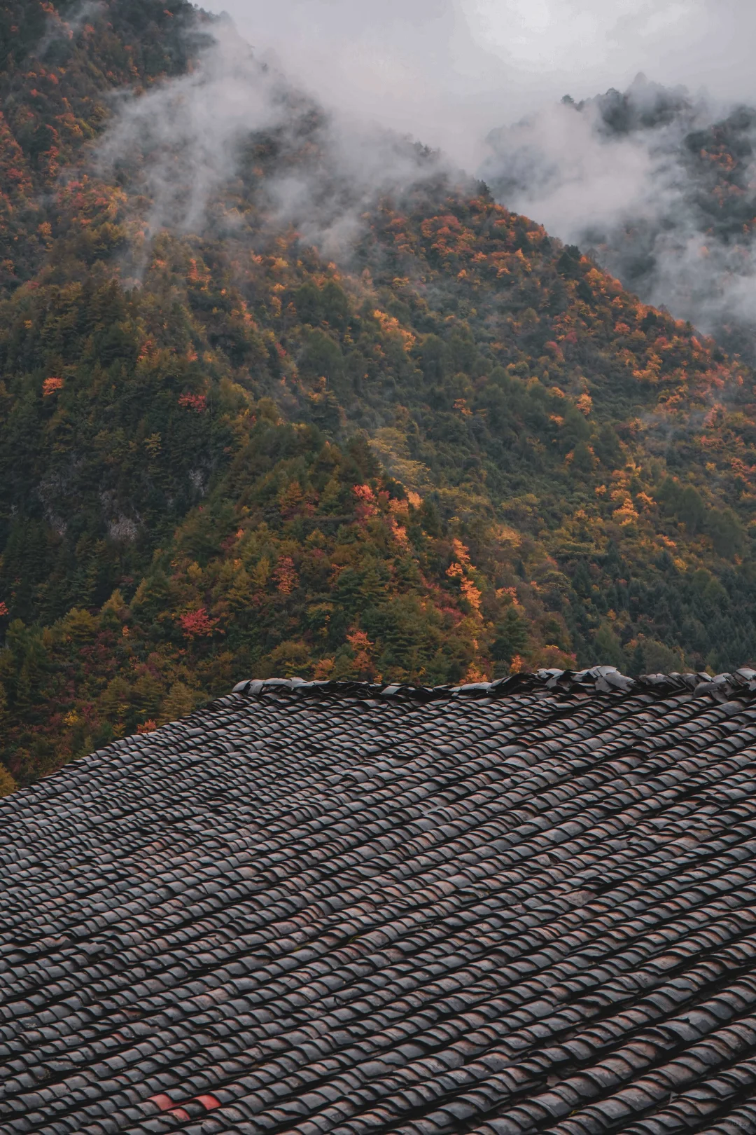 红枫、金黄的银杏、墨绿的山林