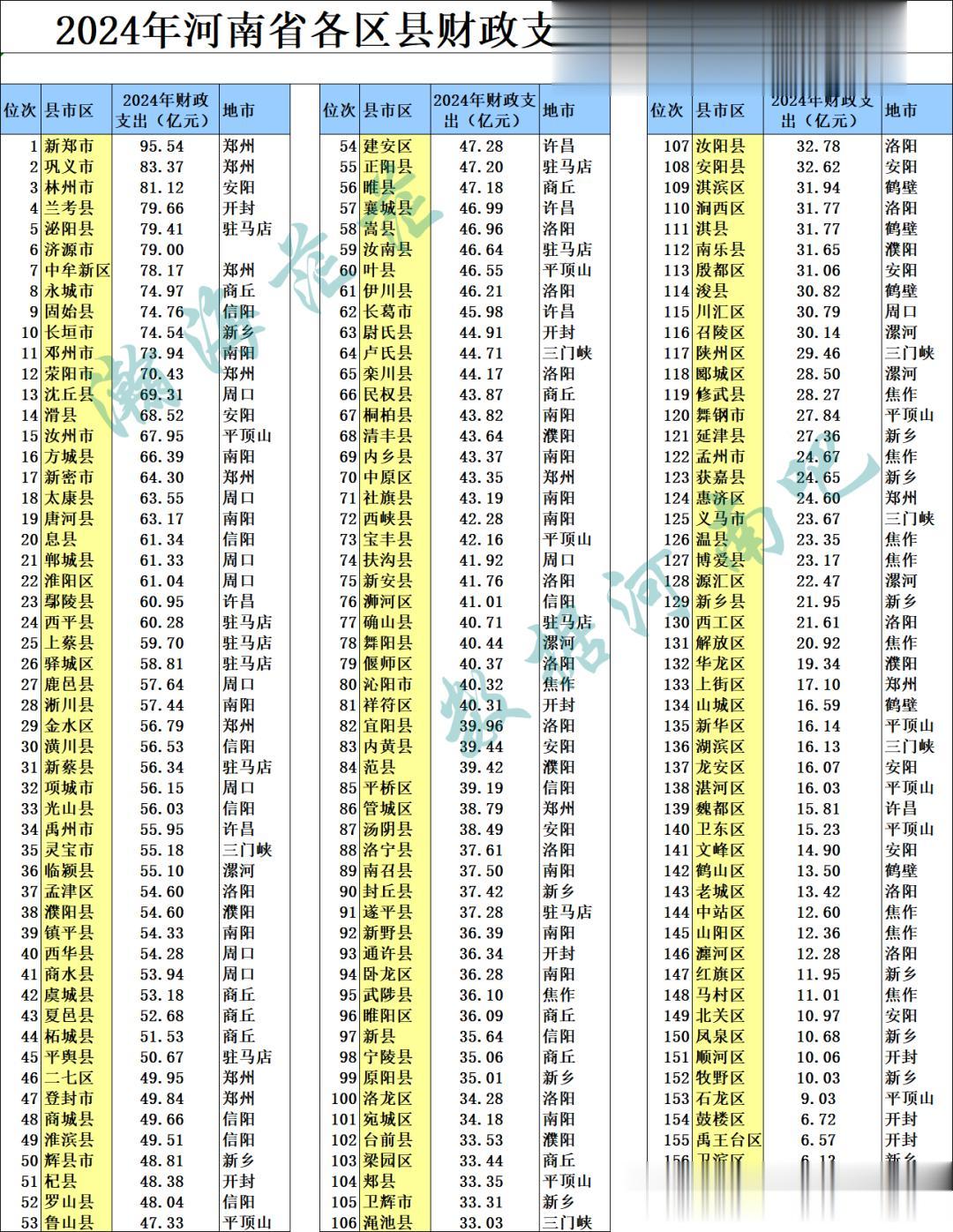 郑州市航空港区财政支出最高,达到了164.7亿,是全省唯一一个超过100亿的区县,新郑市和郑东新区超过90亿分居二三。