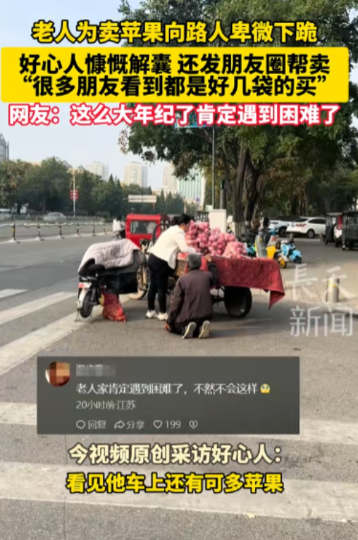 河南商丘,一满头白发的老大爷为了将车里的苹果尽快卖掉,竟然卑微的给过往路人下跪,称苹果是赔钱卖的,希望有人可以购买,路边的好心人看到后,不仅慷慨解囊购买苹果,还自发的帮老人宣传,网友:这么大年纪肯定是遇到困难了。 在商丘的一条繁忙街道上,清晨的阳光洒在路面上,街道上人来人往。突然,一幕让过路人都不禁驻足。