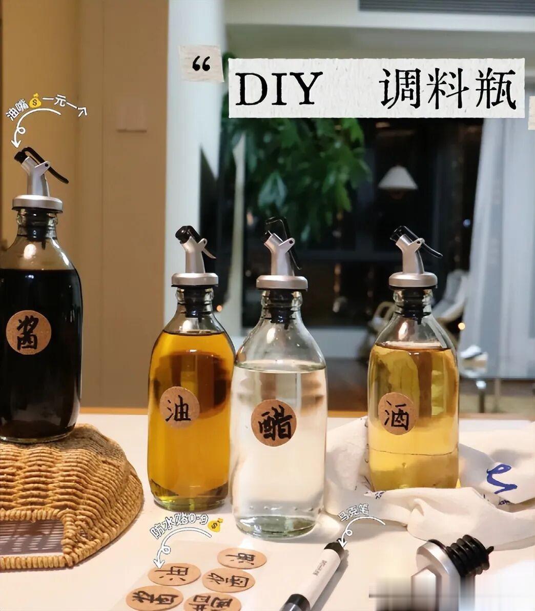 现在有这种玻璃瓶了之后,直接全都分装了一下,用玻璃瓶装好,买了几个瓶嘴,组装起来这不就是调料瓶吗?