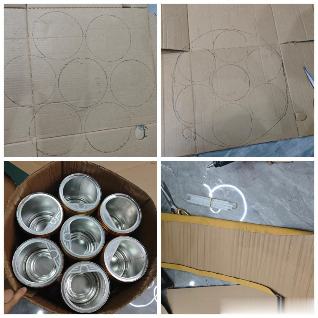 把纸壳剪裁一下,再把奶粉罐固定在纸壳上面,侧面用纸壳继续包裹起来。