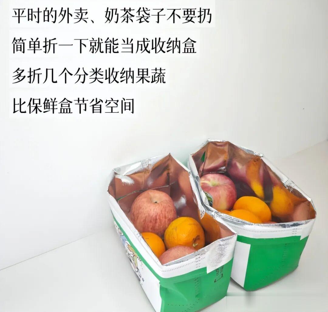 把奶茶袋子折叠起来,放进冰箱里面,原本没有分层的冰箱,轻轻松松就可以划分好区域,袋子里面装上水果啊、蔬菜啊,刚刚好。