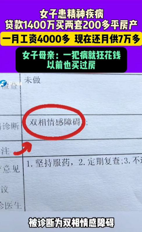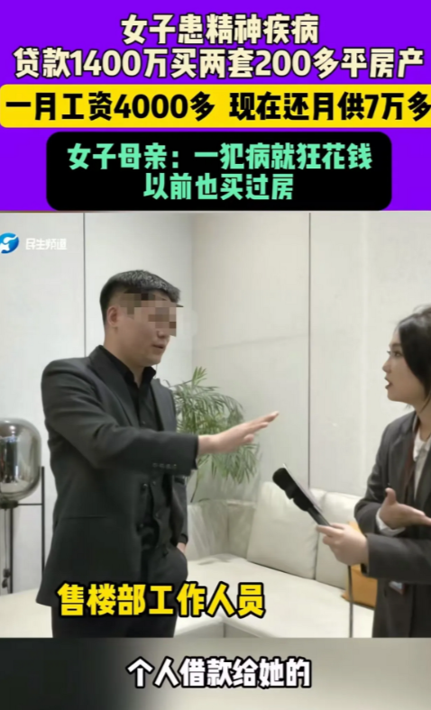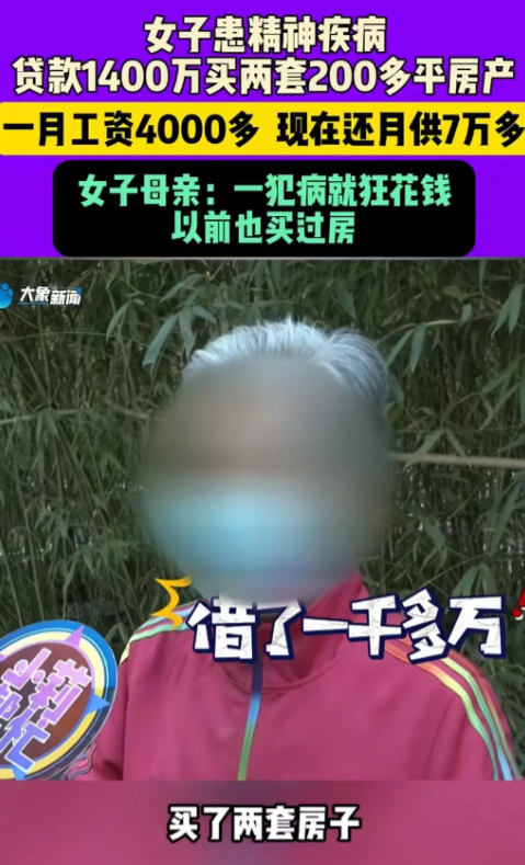 参考来源:河南广播电视台小莉帮忙-11月10日,郑州,女子患精神疾病,贷款1400万买两套200多平房产,一月工资4000多,现在还月供7万多。 女子母亲:一犯病就狂花钱 ,以前也买过房!