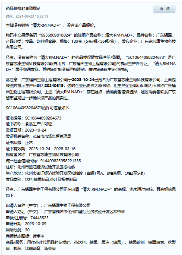 药价315显示:清大RM·NAD+包装印着“清华研发”,实际只是广东富芯康生物科技有限公司生产的一款普通固体饮品,与清华大学无任何关系。