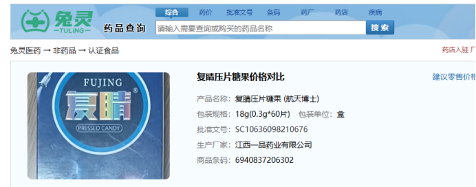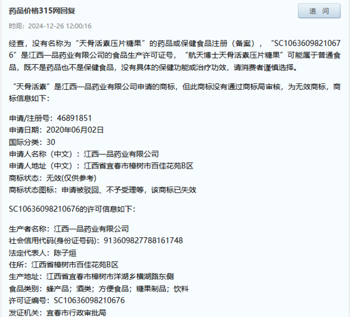 经查,没有名称为“天骨活素压片糖果”的药品或保健食品注册(备案),“SC10636098210676”是江西一品药业有限公司的食品生产许可证号,“航天博士天骨活素压片糖果”可能属于普通食品,既不是药品也不是保健食品,没有具体的保健功能或治疗功效,请消费者谨慎选择。