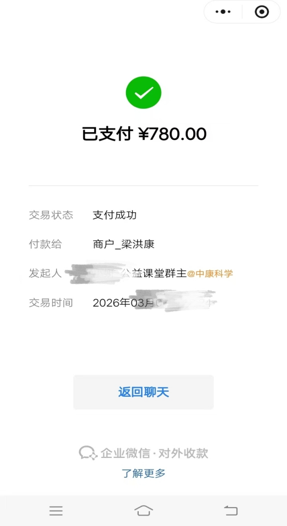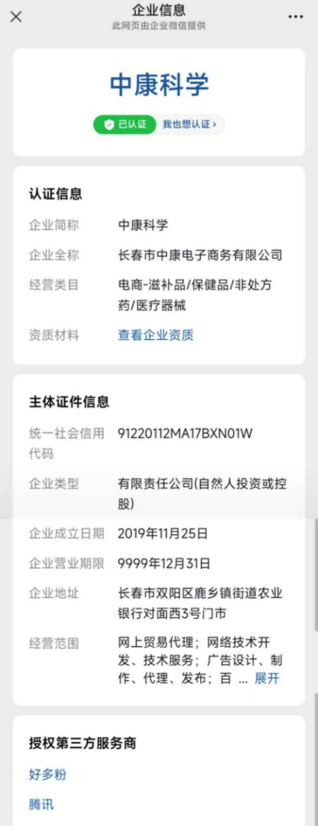 核心收款方:长春市中康电子商务有限公司(简称“中康科学”),法定代表人为梁洪康,正是群聊中收款“商户_梁洪康”的主体。该公司成立于2019年,注册资本仅10万元,员工人数为0,自身风险和历史风险均为2,存在经营异常和高风险提示。