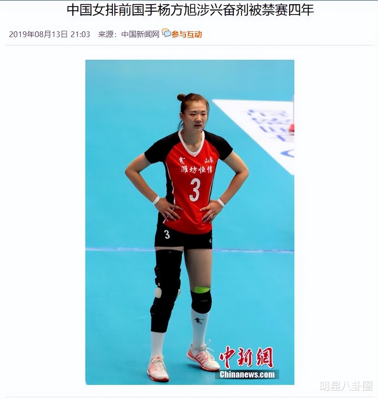 然而,就在人们期待她再次绽放光芒时,意外却再次降临。在亚运会开幕前夕,杨方旭突然从中国女排名单上消失了。直到 2019 年 8 月 13 日,国家体育总局反兴奋剂中心公布三起兴奋剂违规事件,人们才得知真相:杨方旭在 2018 年 8 月 11 日的赛外检查中,被发现外源性促红细胞生成素(EPO)阳性,被禁赛四年,禁赛期至 2022 年 9 月 11 日。这一消息如巨石投入平静的湖面,瞬间激起千层浪。