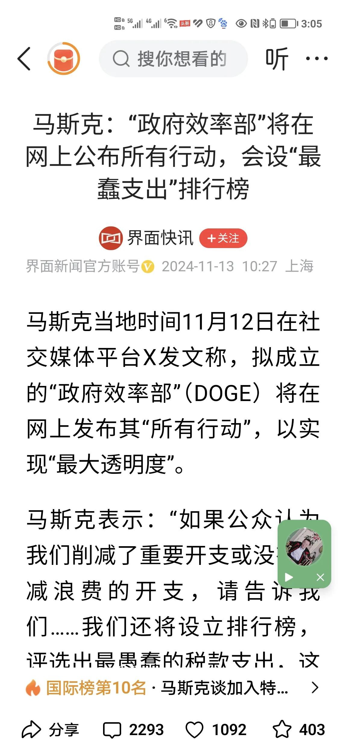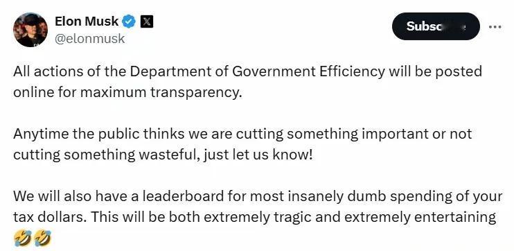 投桃报李?美国候任总统特朗普已公布美国首富特斯拉企业负责人马斯克为美国当下届政府拟成立的政府效率部负责人? 据界面新闻官方帐号文章公开报道,美国当地时间12日,候任总统特朗普已正式公开宣布提任在大选中鼎力支持自己的美国首富特斯拉企业掌门人马斯克为其其领导下拟成立的美国“政府效率部”负责人。 特朗普指出马斯克将与美国企业家维韦克·拉马斯瓦米将领导拟成立的“政府效率部”。 他同时还表示,“政府效率部”将为拆解政府官僚机构铺平道路,削减多余监管法规及浪费的开支,并重组联邦机构。 界面新闻官方帐号的文章同时指出,马斯克同时也在自己的社交平台x已迅速公布了自己将要主导的政府效率部的有关施政纲领和工作计划。 马斯克在社交媒体平台X发文称,他所领导的拟成立的“政府效率部"将会在网上发布其所有工作行动,以实现其工作的最大透明度。 马斯克同时表示,如果公众认为他们削减了重要开支或没有削减浪费的开支,请告诉他们,他们将努力改进自己的工作。为了使政府效率部的工作卓有成效,他们将会将设立政府支出排行榜,定期评选并公布出最愚蠢的税款支出。他说,这项措施对施政者来说也许是极其悲惨和痛苦的,但他相信这也应该是一项极其有趣和有意义的工作。 以上内容和图片均来自网络,本文旨在分享热点。若有侵权,联系必删。