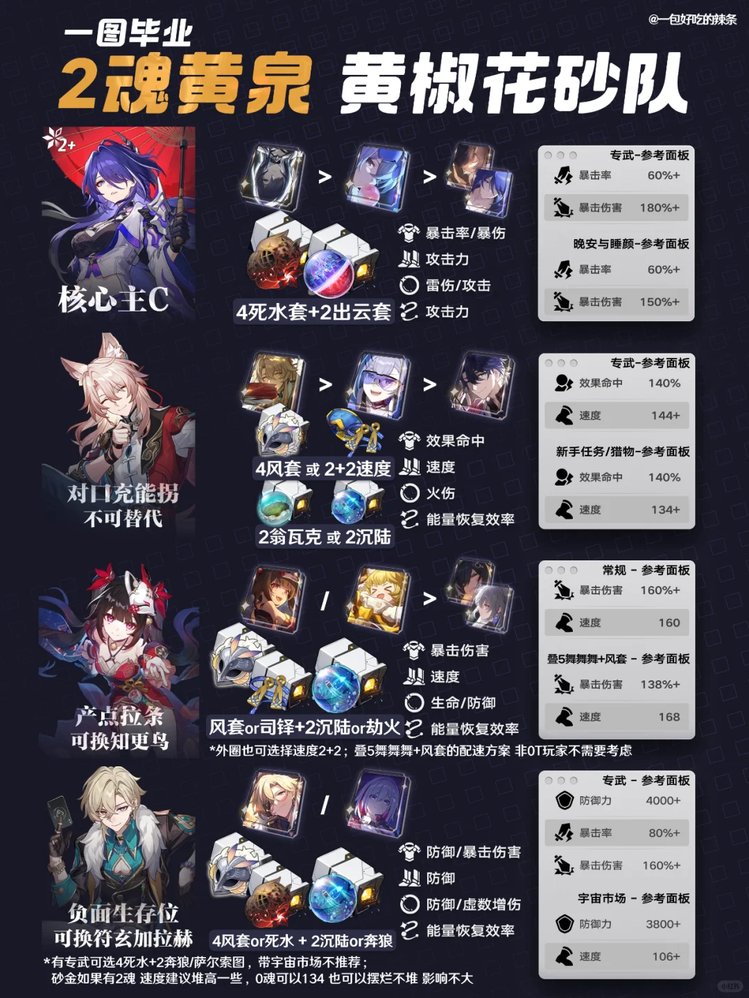 大家好,这里是辣条~ 本篇是『黄泉队』的全队培养攻略~ 椒丘之后出了一些适合黄泉队的新遗器,翻新黄泉一图流 2魂及以上(2-6)第二张图都适用 并非只适合2魂黄泉 ————————————— 如有遗漏/错误欢迎指出,共同进步~ 最近新玩家/回坑玩家多,大家友善讨论哦~ —————————————