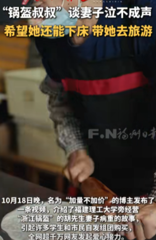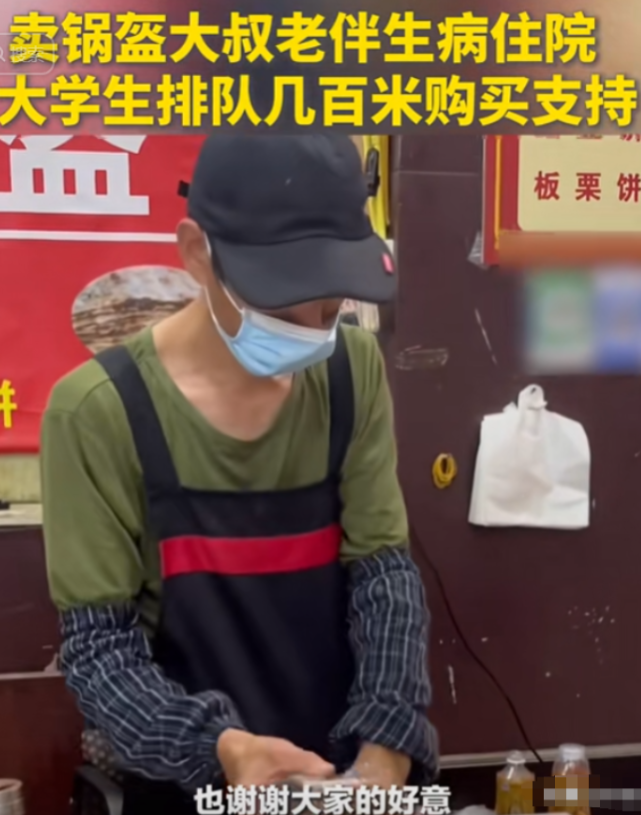 2024年,福建一男子,为了身患重病的妻子,全年无休地在校门口卖锅盔。学生们得知此事,纷纷关照起男子的生意。不料,男子的一个举动,再次让学生们热泪盈眶。网友:我这就去买锅盔吃...... (来源:腾讯新闻、光明网) “老板,来几个大份的锅盔,钱给您转过去啦!” 在某知名大学外,你可能会看到这样一番神奇的景象。只见有数不清的学生和社会人士,在一家小小的锅盔摊子前面“大排长龙”。 并且,绝大多数顾客,还专门都选最贵的买。 更令人惊讶的是,即便摊主出餐速度并不快,在场的那么多人,竟没有一个人会出声催促。 只因为,在这个离奇的场景背后,其实隐藏着一个令人感动的故事! 家住在大学附近的刘大叔(化名),与妻子共同经营着一家锅盔小摊。 因为出了名的量大管饱,再加上两口子偶尔会给贫困学生,提供免费锅盔。所以时间一长,二人也招揽到了不少的忠实客户。 可突然有一天,熟悉的锅盔摊子没有出现在校门口,并且一连消失了很长时间,这让学生们感到十分担心。 于是,在刘大叔重新经营的第一天,众人便一股脑地围了上去,七嘴八舌地问起了原因。 而从刘大叔的口中,众人也得知了阿姨重病的消息。 由于经济困难,刘大叔不得不放弃陪伴在妻子的身边。重新经营起这个锅盔摊子,以求能够凑齐医药费。 在得知了具体情况后,学生们自觉地排起了长队,纷纷在刘大叔家买起了三餐。 并且,在挑选的时候,学生们也都会将能加的都加一遍,只为给刘大叔提供更多的帮助。 对此,刘大叔则表示:“谢谢大家的好意!但妻子和我都讲究诚信经营,即便现在有了困难,也绝不会多收大家的钱!” 一瞬间,所有在场的学生,都被刘大叔的精神,给深刻地折服了。 而在学生中,一位姓陈的女同学,主动将刘大叔的情况,发布到了网上。 看这样一位有诚信、有爱心的摊主,所有人都表示了支持。于是,随着消息越传越广,在刘大叔的摊子前,便出现了如今的盛况。 对于大家的善意,刘大叔也备受感动。但他还是数次向大家劝解道:“请大家理性消费,锅盔不是什么稀罕的食物,大家不用一次买这么多,浪费掉就不好了。只要大家有这份心,我就已经很感动了!” 世上总有淋着雨的人,关心别人会不会受委屈。凭借着这份纯粹,刘大叔的未来,一定会是好运连连! 也感谢那些主动献出爱心的人们,有了他们的存在,社会的将来,一定会更加地明亮!