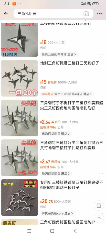 这扎胎器到底专业到什么程度呢?假如你在淘宝搜索三角扎胎器,就可以找到这东西。