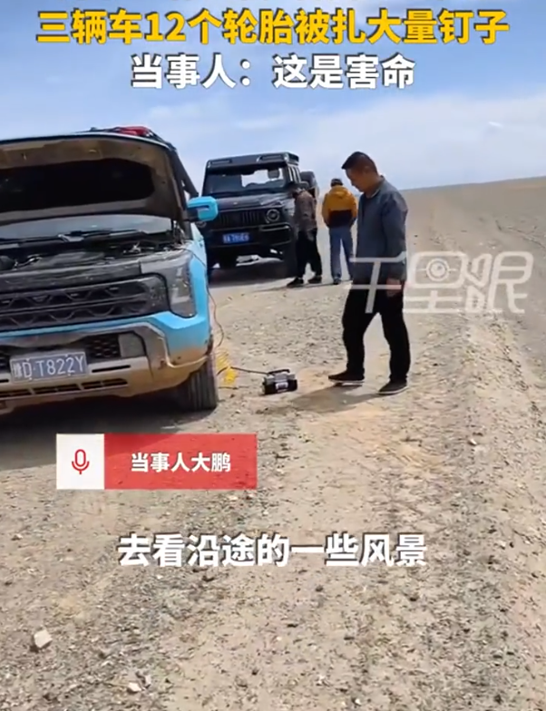 这事发生在青甘环线,几名旅游博主的三辆车,全部被专业的轮胎扎胎器所伤。