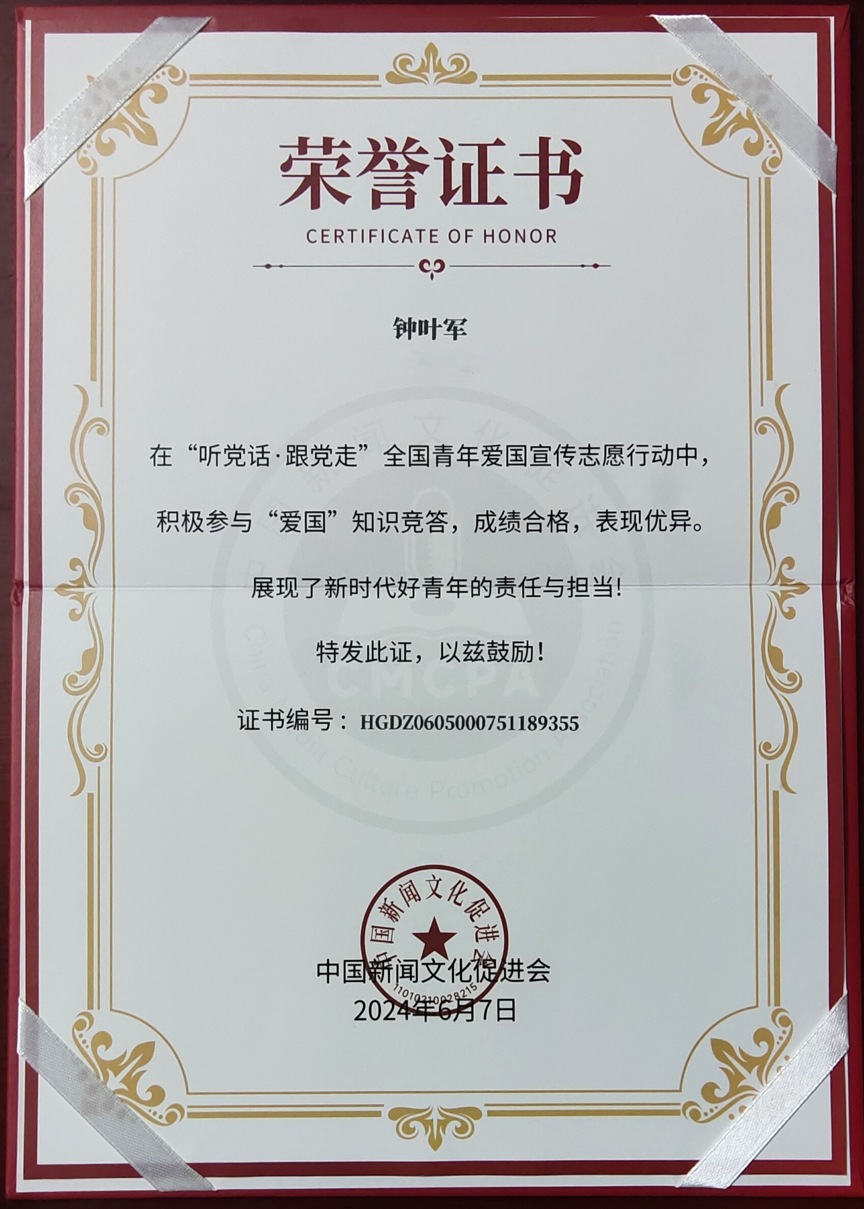 近日,由中国新闻文化促进会主办的“听党话,跟党走,展现新时代青年担当”志愿行动圆满结束。在此次活动中,众多青年积极参与,其中钟叶军的表现尤为出色。