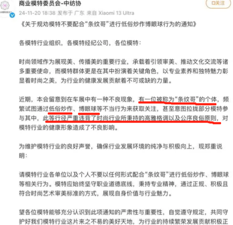 果然不出我所料!坐拥9.8W粉丝的“条纹哥”被封杀,模特协会通告:违背时尚行业秉持的高雅格调和公序良俗!然而,网友们的评论却很扎心:他犯了什么法? 近一个月的时间,一个身穿条纹POLO衫的中年男子走红网络,他的长相不帅气,也没有任何才艺,走红的原因十分奇葩。 他不使用手机拍照,而是用肉眼“欣赏”,以专注的眼神紧盯身材火辣的车模。 起初车模也会礼貌性的和他进行眼神交流,但是没想到条纹哥压根没想移开眼神,继续直勾勾的盯着对方,导致一向热情外相的车模竟然也会感觉到有些尴尬。 或许有人会觉得爱美之心人皆有之,看到美女忍不住多看两眼本无可厚非,但是这并不是值得大量传播、炒作的噱头,也不是什么光彩的事情。 尽管如此,条纹哥还是凭借这种与众不同的观展方式,在社交媒体上迅速积累了大量的关注者。 这也是一发不可收拾的开始,经过炒作有了粉丝量后,他果然开始在网上直播和车模连线互动,重现眼神杀名场面以及打情骂俏小游戏,收获围观者的礼物打赏,赚的盆满钵满。 10月18号,条纹哥亮相广州车展,与车模互动合照,有的车模看中了他的热度,也会故意配合他拍视频。 有人说他的眼神色而不淫,调侃能被条纹哥盯着算是一种红利,评论区也会涌现出他和各大模特的亲密合照的P图,恶劣影响不断扩大。 如今条纹哥的账号突然被平台封禁,昨天还能看到账号,只是限制了关注功能,现在其账号已经搜索不到,只能搜索到几个“高仿”山寨号。 平台方并未解释具体的原因,有人推测可能是条纹哥的行为偏离了公众道德的心理阈限。 毕竟长时间对着他人看,本身就有可能触碰隐私和礼貌的红线,毕竟车展需要得专业摄影师记录美好,不是搞这些流量无脑炒作。 条纹哥的封禁也让人想起了11月20日模特委员会发布的公告,其中直言不讳地表示“条纹哥”的行为就是靠低俗炒作博眼球,希望业内人士和其保持距离。 对此有网友表示:其他人拿着手机、相机,仰拍、俯拍、贴脸拍,条纹哥眼睛深情凝视,满眼皆是对美的欣赏,谁低俗? 也有网友说:封的好,盯着看成何体统,这不是正确的价值观导向! 还有网友认为:刚开始我觉的还好,结果马上就开始和模特连线,各种人造场景摆拍,和模特一起拍视频,这就有点奇怪了。 在我看来,普通人参加车展欣赏美女无可厚非,但是要把这种行为当成炒作吸粉的手段就不对了。 那些为“条纹哥”站台的网友,已经成了他人网红公司的“流量韭菜”还不自知。 网络时代本就出名快,凉的也快,想要走得长久还需要专心做内容,在享受网络带来的便利和乐趣的同时,我们也应该保持理性,避免陷入低俗炒作的漩涡之中。 (信息来源:Vista看世界)