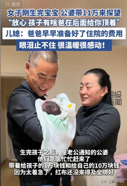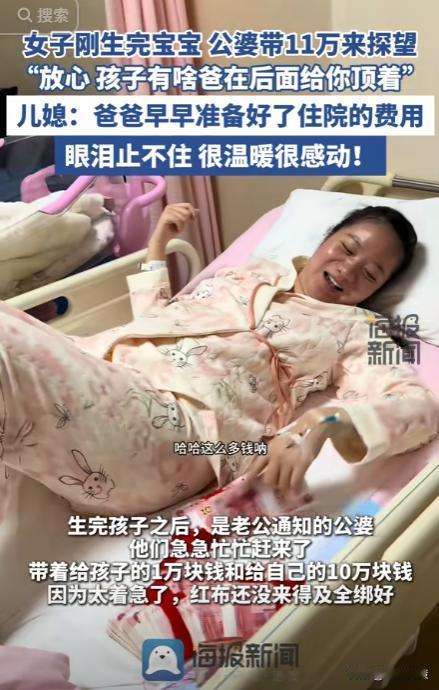 羡慕死了!河南,女子生二胎没和公婆说,生完之后才敢通知!万万没想到,公婆居然送来110000元现金红包!公公的一句话,让儿媳的眼泪止不住了!网友:往哪个方向磕头能有这样的公婆? 王女士(化名)真是嫁对了人,自从结婚后,公婆都把自己当成亲生女儿看待,所以她们一家没有令人烦恼的婆媳纷争,一家人生活的特别和谐幸福,婚后没多久,王女士就怀孕了,是个小公主,生孩子的时候,公公婆婆比亲生父母还要担心自己的情况,在医院门口急的团团转,深怕出什么差错,甚至就连男儿有泪不轻弹的公公都因为这事在医院里哭了起来。 不过好在一切十分顺利,小公主也平安降临,自从有了第一胎,公公婆婆更加对自己关照,甚至总是帮忙带孩子,在这样的家庭氛围里,王女士也有底气计划着再要第二胎,并且在老大上学后,怀上了,这不前段时间到了预产期,即将分娩,王女士并没有通知公公婆婆,怕他们过于担忧劳心费神,就和丈夫商量着生完再说。 谁知分娩完毕,公婆得知消息后乐开了花,竟然拿着十一万现金来到医院,进门就给小宝宝一万的见面礼,剩下的十万全部给到在病床上养身体的王女士,并且公公还说了一句话:放心领,有什么事我和你妈在后面给你顶着,啥都不要管。 王女士瞬间泪流满面,他们的幸福事件发到了网络上,网友们纷纷感到无比羡慕:真羡慕这样的公婆,俺家的都是买东西不给我吃,把儿媳妇当外人 “羡慕嫉妒恨啊!我一毛也没有了” “这样的公婆去哪里能找到,太幸福了” 来源:海报新闻